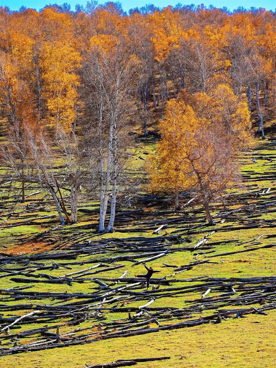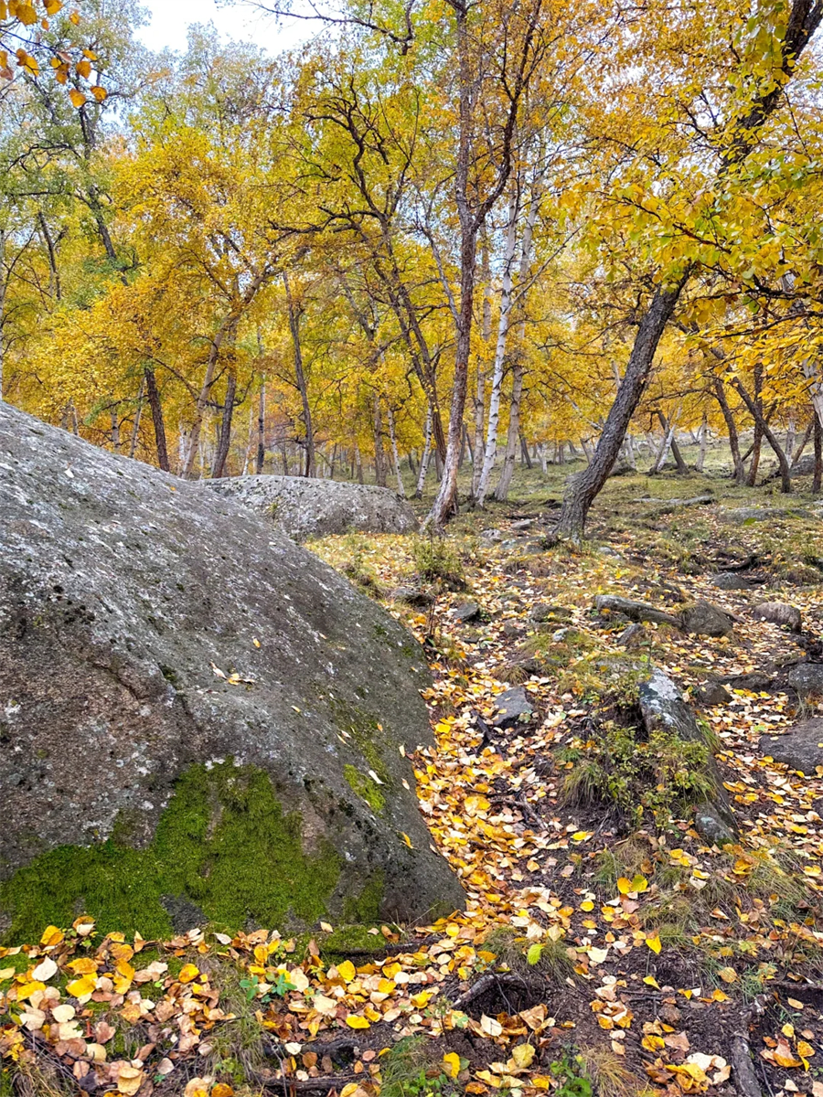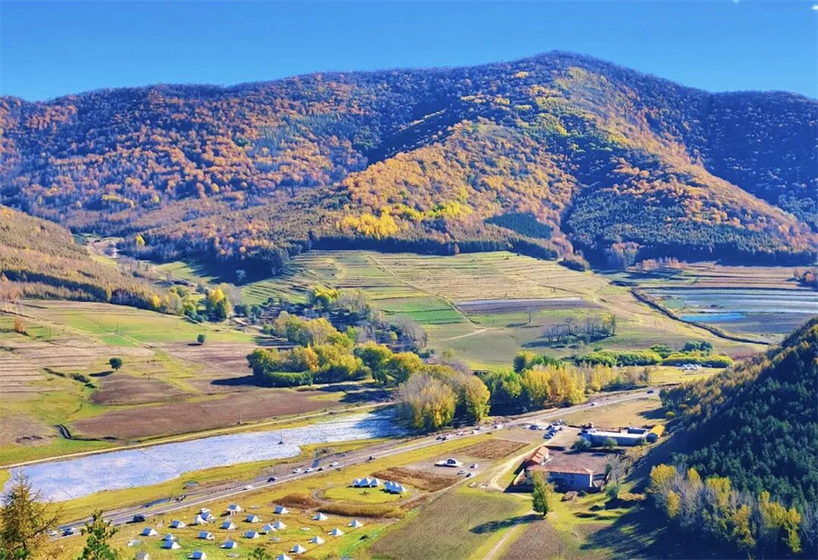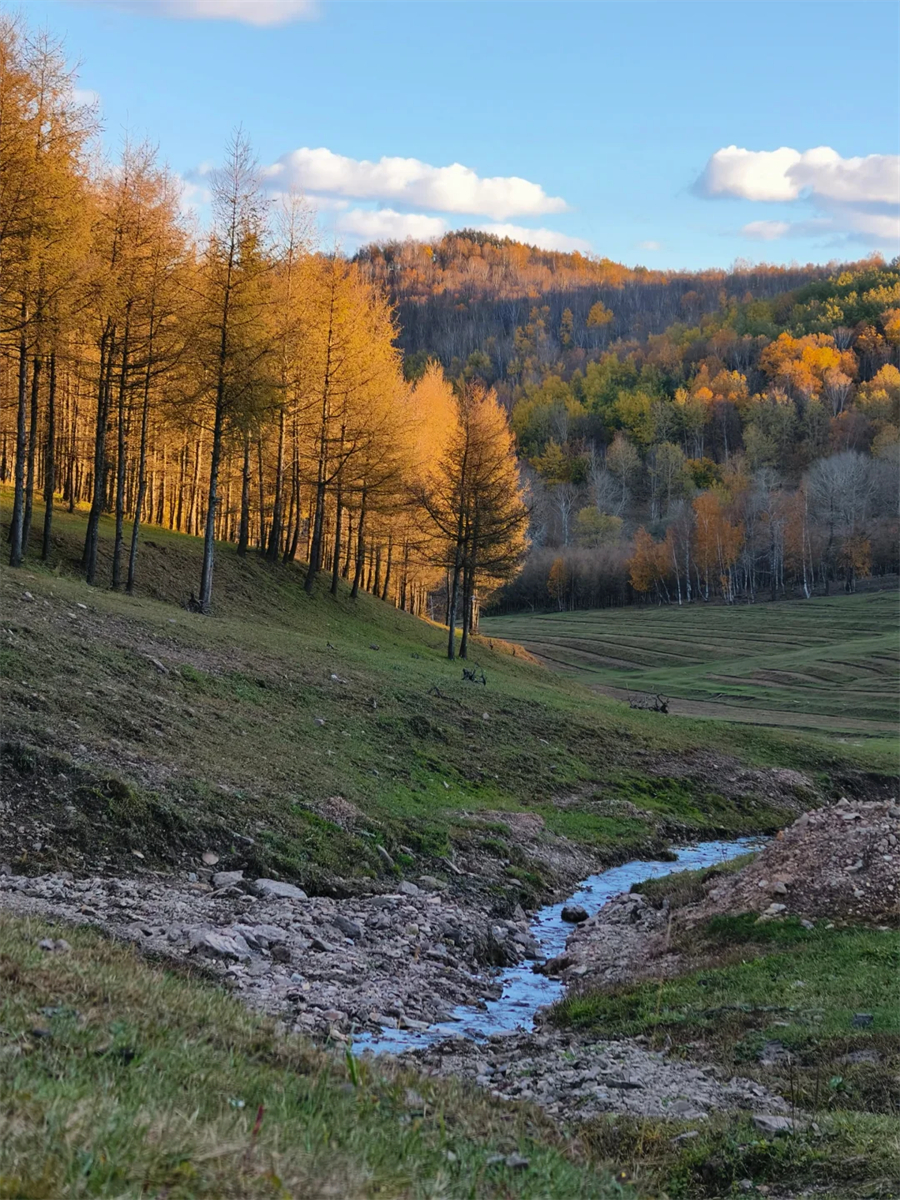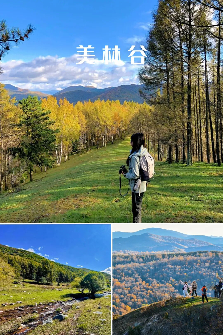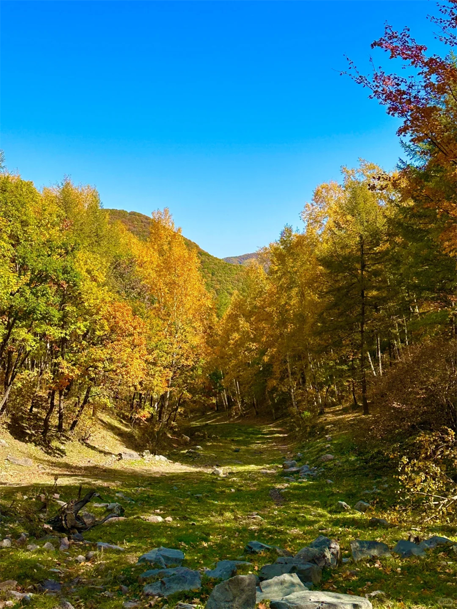 美林谷-峡谷秋色 燕山北麓的美林谷,U型山谷幽深而宁静。华北落叶松率先点燃秋色,阔叶混交林贡献红橙黄褐的渐变色彩。漫步在金色小径,阳光穿林洒落,脚下草地柔软有弹性,伴随牛铃声与风声,仿佛时光停滞