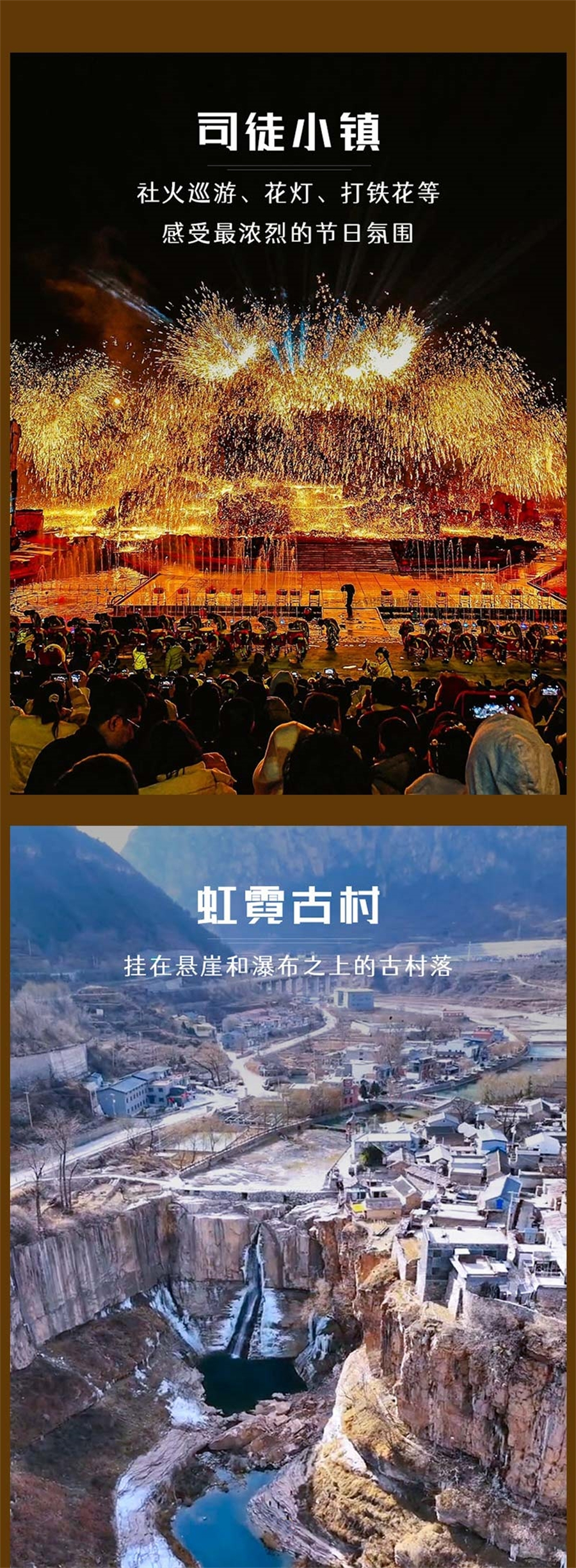 傍晚我们适时前往神秘的【司徒小镇】,大家可以逛逛,这里年味十足,踩高跷、扭秧歌、舞龙狮,消逝已久的民间年俗在这都可以亲身经历。除此之外,我们还可回顾观看老山西的风云往事——走西口、出镖等实景演绎。夜幕降临后,我们将共同欣赏千人演绎的民俗绝技——打铁花!这是一场铁与火的硬派实力展现,更是刺激五官、让人惊叹的震撼画面!