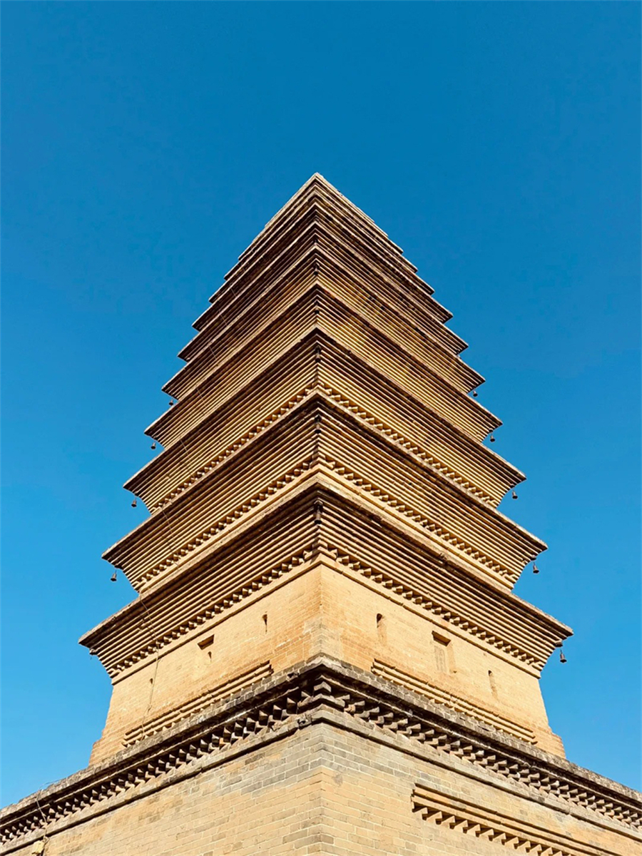 建筑特点:宝轮寺塔为13级叠涩密檐式砖塔,塔高26.5米,周长21.6米。塔底有台基和台座,塔身自下而上逐层收敛,外形呈抛物线状。塔身用青灰条砖一顺一丁垒砌而成,每层分别辟有半圆形拱券门、佛龛、窗洞,翼角下悬有风铎,塔内有塔心室和梯道。
