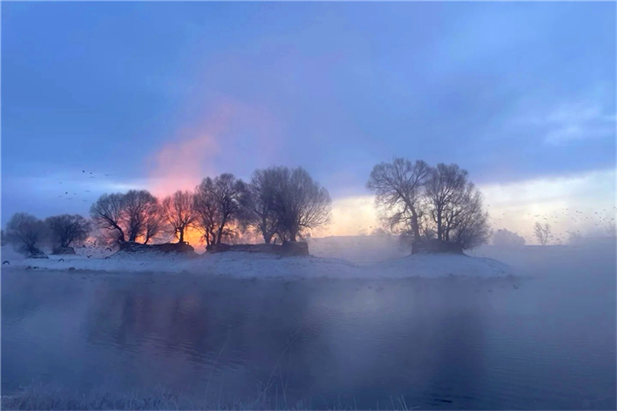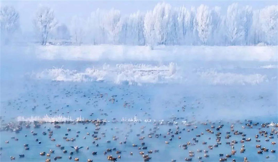 呼和浩特千岛湖(俗称哈素海)冬季的雾凇景观堪称塞北奇观,冷流雾遇低温凝结于湖畔林木,形成玉树琼枝的冰雪秘境。晨光中,垂柳、芦苇皆披挂晶莹冰晶,每根枝条被毛茸茸的雾凇包裹,在蓝天下如珊瑚绽放。水面蒸腾的雾气弥漫林间,阳光穿透时泛起钻石光晕。静谧湖湾中,冻僵的舟船与芦苇丛皆覆银装,风过处冰棱簌簌,恍若童话世界。最佳观赏期为12月至次年2月的清晨,需穿戴严密防寒装备,-15℃至-20℃的气温里,这片冰羽森林更显北方冬季的诗意与纯粹。
