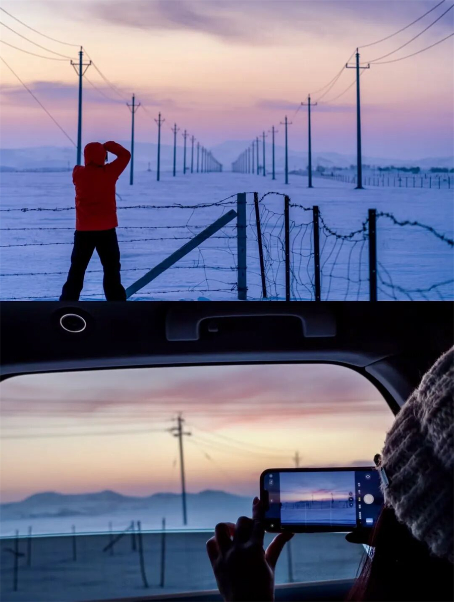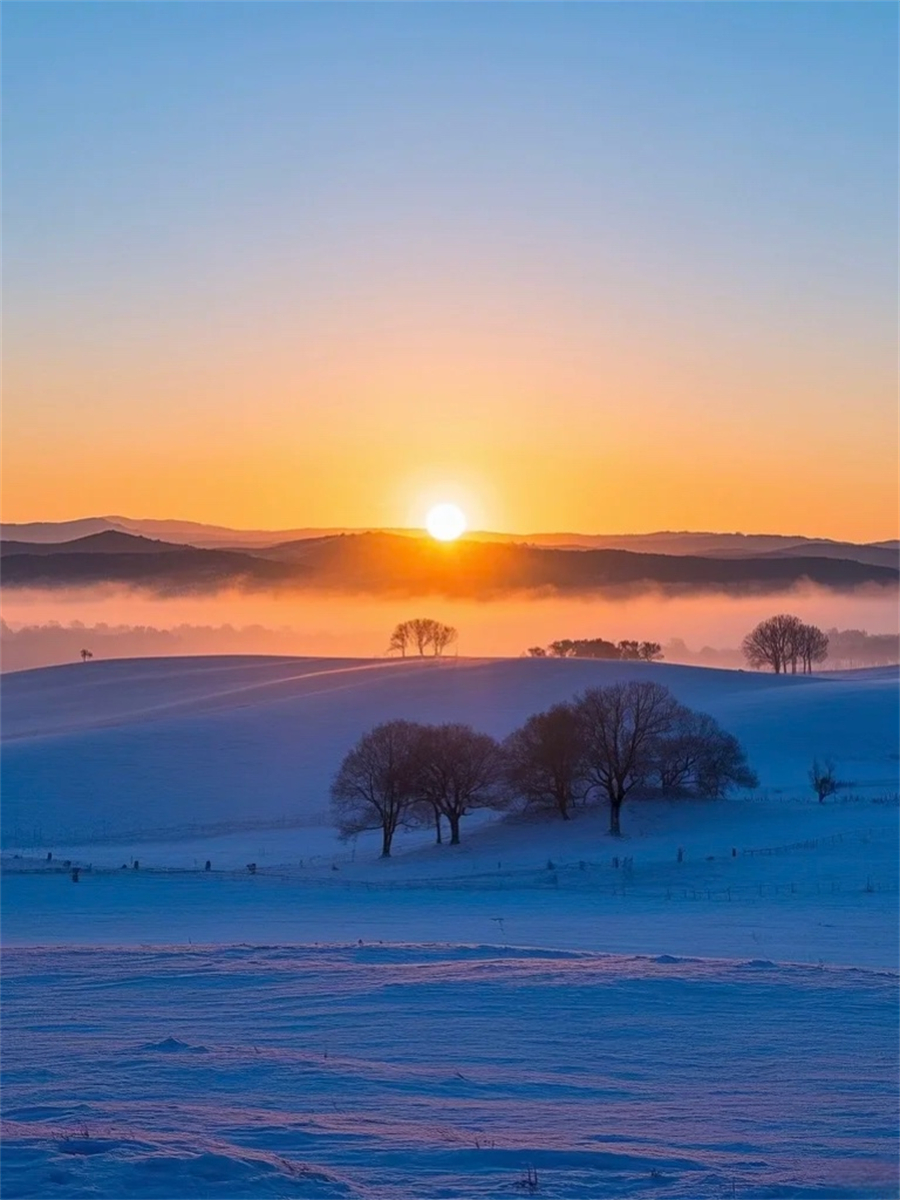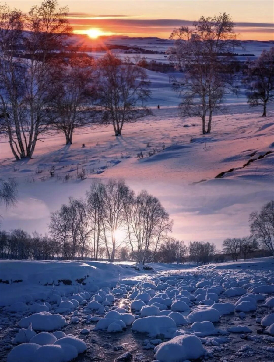 随着夕阳西下,我们驱车看日落,乌兰布统草原的夕阳,骏马与落日的搭配、光影与自然的交融,天边渐变的红色与蓝色的融合,构成一幅精美的画卷,站在白雪皑皑的草原,欣赏着落日余晖,品味着壮美残阳,看着夕阳一点点从地平线消失,这里有雪丘之上的排排白桦林,在阳光照射下白桦树干与白雪争辉,长长的树影拖在雪丘之下层次分明,温柔铺展一幅绝美画卷。幸运的话,还能看到牧民驱赶羊群、牛群回家。