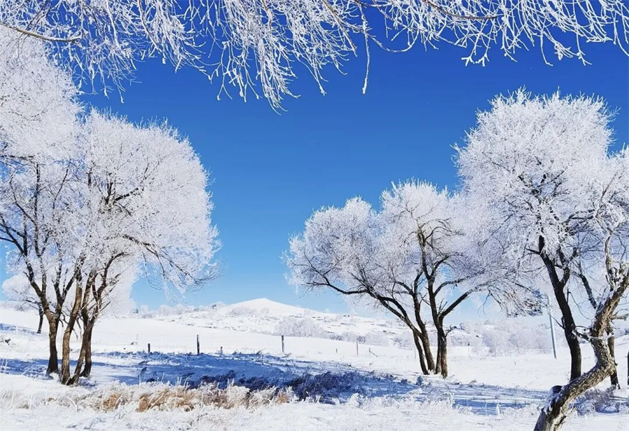 上午|早餐后前往乌兰布统的小河口欣赏树挂(也叫雾凇)在低温的大地结晶,这就是美丽的冰花,大量的冰花落在树上,牧场的护栏上,电线上,美景从此出现。这就是大家期待的雾凇(雾凇视受天气影响较大,不一定能看到,如当天没有我们换其它地方玩耍)。