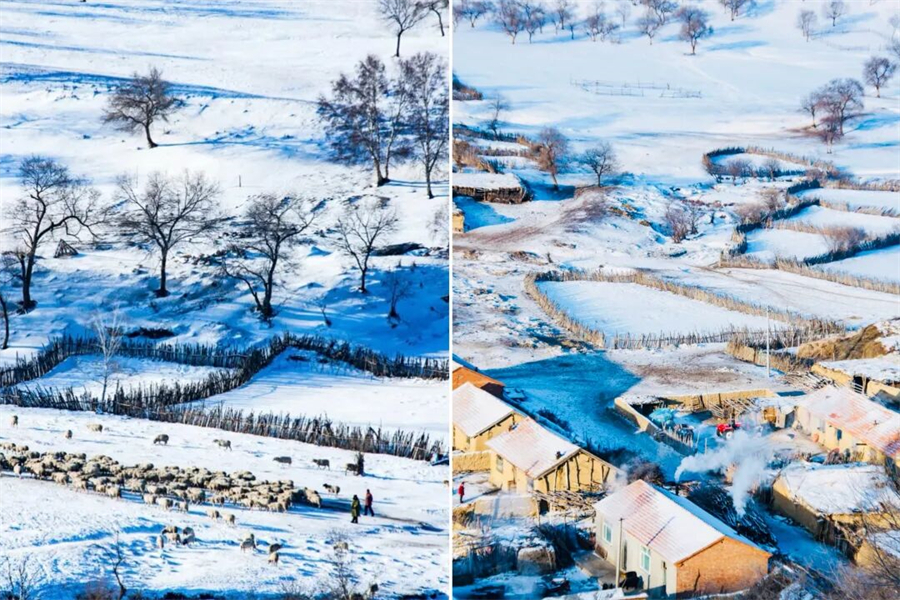 上午|我们换乘越野前往『透风沟』。透风沟是一片藏匿于雪山之间的小河沟。在透风沟一旁的山坡之上,俯瞰这一片被冰雪覆盖的溪水山沟,远方的牛羊围栏,以及被冬日寒风吹拂和越野车碾压而过的雪地纹路。- 之后前往东沟。沿途可以看到小松树林、白桦林,还有远处五彩山。牛羊成群,随处可见。越野最大的乐趣就是探索的过程。