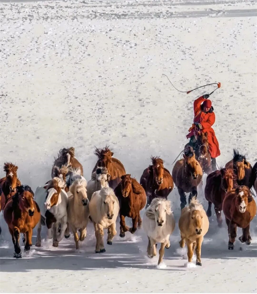 前往拍摄雪地狂奔的马群(费用自理),马倌会根据大家的拍摄角度让追赶着马儿奔跑在辽阔的大草原之上。冬季拍摄雪地奔马场面远远好于夏秋季节奔马的场面,拍摄马匹在雪地奔跑,鬃毛、马尾、溅雪、哈气的画面层次动感强烈,气势磅礴。