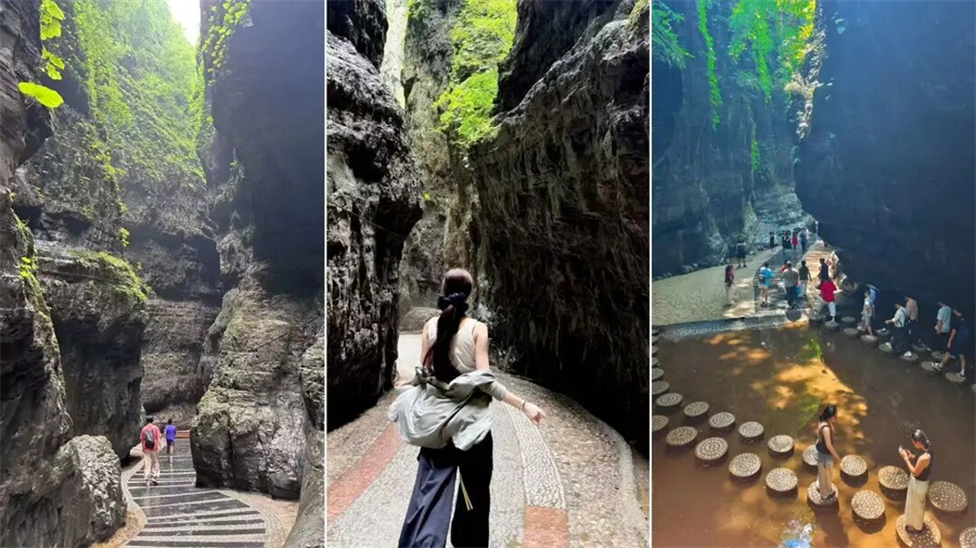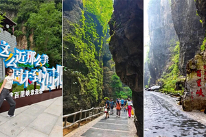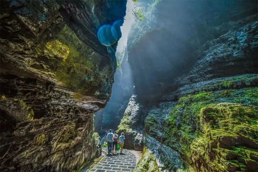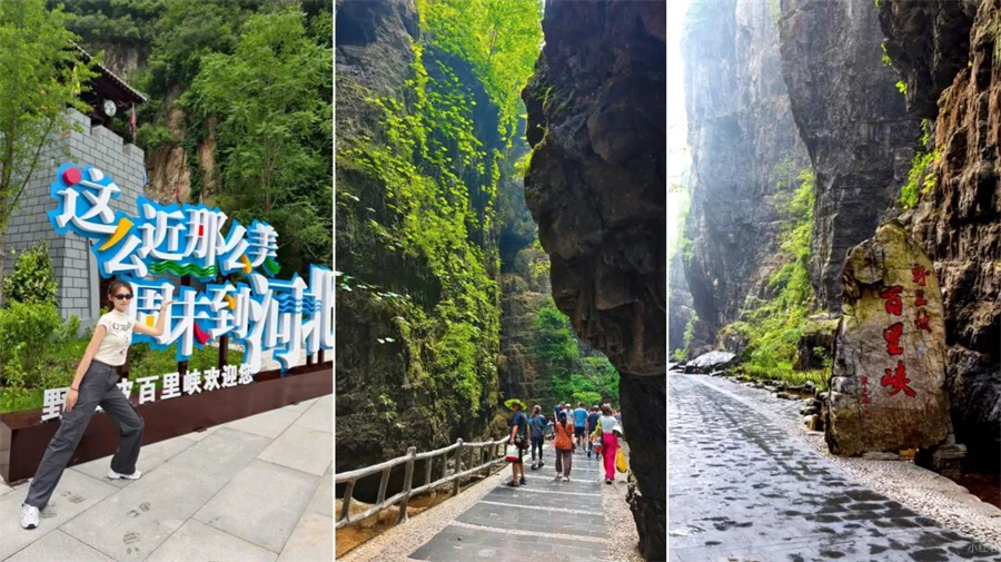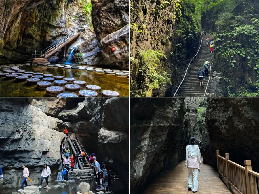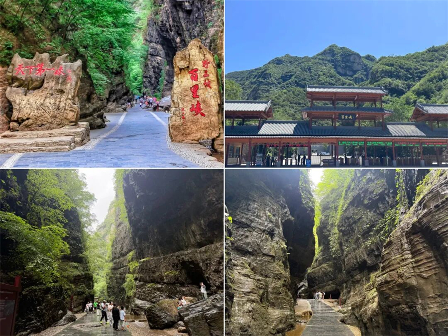 百里峡最精华的游玩路线是在没抵达天梯之前的徒步线路。这一段以平路为主,伴有缓步台阶。典型的嶂谷地貌,两侧峭壁如刀削斧劈,最窄处“一线天”仅容一人通过,超级震撼!阳光透过缝隙洒下来,光影绝美。两侧山泉水水流涓涓,植被覆盖率超高,像个天然的大空调房。