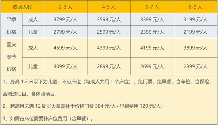 ▷身高1.2米以为儿童,不占床位(与成人共用1个床位),免门票,免早餐,含车位,含保险,含赠送项目,含体验项目;▷越高且未满12周岁大童需补半价格门票384元/人+早餐费用120元/人;▷如需占床位需要补床位费用(含早餐);▷特别备注:儿童不占床位(与成人共用床位),但是若您1大1小出行,为避免打扰您和同房其它游客的休息,则儿童必须占床并补床位费用(含早餐);▷参团类型:2-12人精品mini小团▷报名前请提前咨询客服是否有余位。