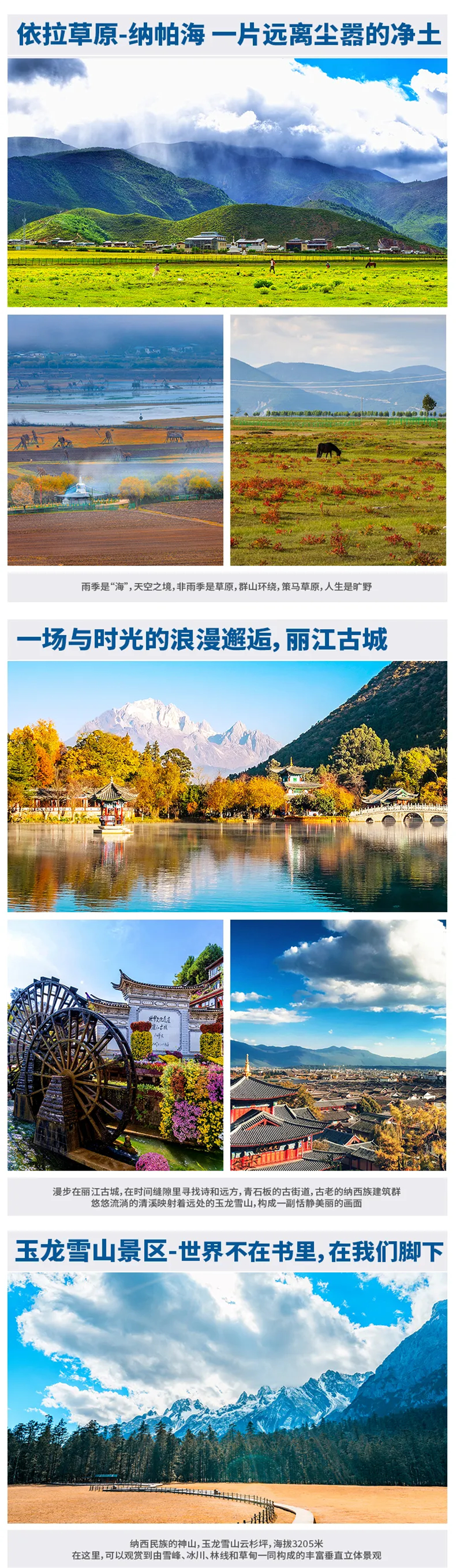 预 定 须 知● 本公司作为活动发起方和执行方,拥有旅行活动期间所有照片、视频等素材的使用权。● 本活动因涉及户外徒步、长途坐车、刺激项目等情况,报名人需确保身体健康适宜旅游,有高血压、心脑血管疾病、传染性疾病、呼吸系统疾病、精神病、严重贫血病、大中型手术的恢复期病患者、行动不便者、孕妇等情况游客谢绝参加。代他人报名者,须准确了解被报名人的健康情况是否满足本线路要求。● 根据旅游法相关规定,18周岁以下未成年人需由监护人陪同参团,并全程由监护人负责照顾。● 本活动谢绝未报名的用户参加(含未报名婴幼儿)。为了他人健康及活动体验,本活动谢绝携带宠物参加。● 报名时务必根据系统要求提供准确、完整的信息,以免产生预订错误影响出行。如因您提供信息错误而造成的损失,将由您自行承担。● 工作人员将根据住宿预定情况进行排房,拼房原则为同性别团友拼房。如需跟家人/朋友同住一间房的,需在报名后告知工作人员。如单人报名要求单独住一间房的,需联系工作人员确认是否能安排,如可安排,单房差费用自理。● 如持有军官证、记者证、伤残证、老年证、学生证、医护证件等可能享受优惠的特殊证件,请在报名后一天内联系工作人员告知并提交相关资料。因旅行社在景区门票上面是折扣票,优惠减免是按旅行社折扣价退还,不以景区挂牌价退还。● 部分景点可能需要游客的个人信息进行门票提前预约(出行携带证件需与出票证件一致),如因景区门票售罄等客观原因导致该景点无法参观,本公司将为您更换其他景点,所产生的费用多退少补。● 行程中涉及的相关景点景色因受天气、季节变化等情况影响,无法保证与活动介绍中的展示保持一致,游客报名即表示知晓并理解本情况。● 活动介绍页展示的导游领队,可能并非最终实际带队领队,本公司有权根据活动安排等实际情况进行调整,游客报名即表示知晓并理解本情况。● 本活动行程实际出行中,在征得客人同意的前提下,领队可能会根据天气、交通等情况,对行程进行适当调整(如调整景点游览顺序、变更集合时间等),以确保行程顺利进行。● 如活动遇上不可抗力的因素,如交通延阻、罢工、天气、飞机火车故障、航班取消或变更时间、机场关闭、景区关闭等情况,或者旅行社、履行辅助人已尽合理注意义务仍不能避免的事件,本公司将尽最大努力协助办理行程变更事宜,如产生差价,多退少补。● 如因不可抗力导致活动出发前取消或中途取消剩余行程,按照《旅游合同》约定,活动费用将会扣除已支付给履行辅助人且无法退回的部分,余款退还到原支付账户。● 游客如因个人原因中途临时退出活动,需签署离团协议,离团后的一切安全责任和费用均由该游客自行承担。 离团过程中,团费包含的未发生且可退回的费用可退回给游客,实际退费金额以旅行社折扣价为核算依据。本公司已支付给履行辅助人且无法退回的费用,无法退回给游客。● 在活动行程中,景区、餐厅、休息区等地存在非本公司安排的购物场所,本公司提醒您,理性消费并索要凭证,如产生消费争议,将由您与售卖商品的商家自行解决。● 报名活动赠送旅行意外险一份,活动出行期间生效。保险理赔电话:参见保单。● 丽江市政务服务热线:0888-12345。