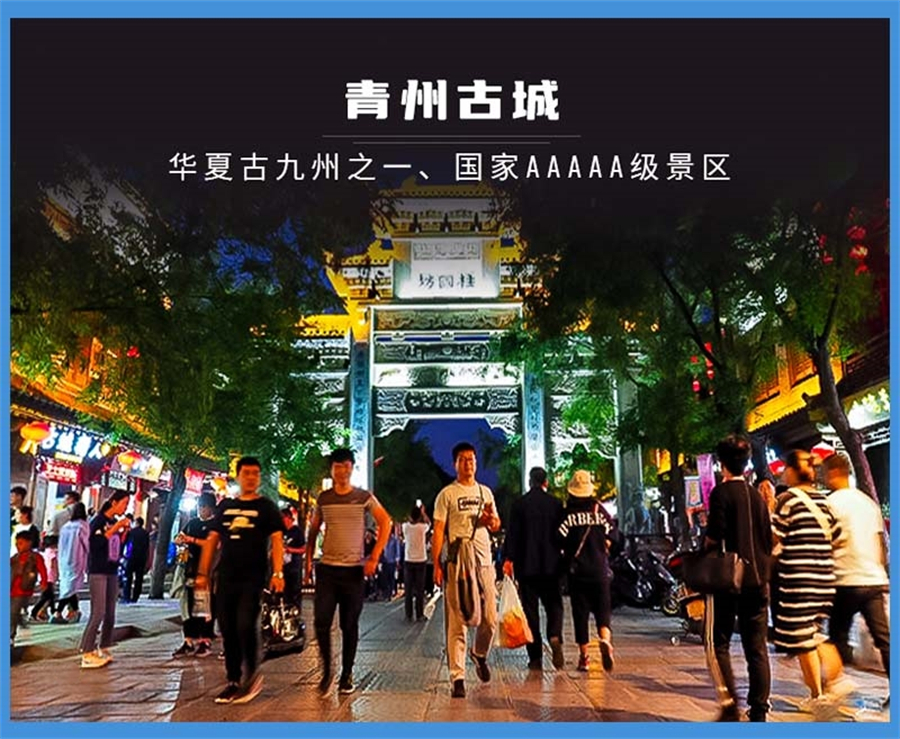 晚餐自由觅食,青州古城内各式小吃很出名哟,夜景也非常漂亮,适时集合前往酒店休息。