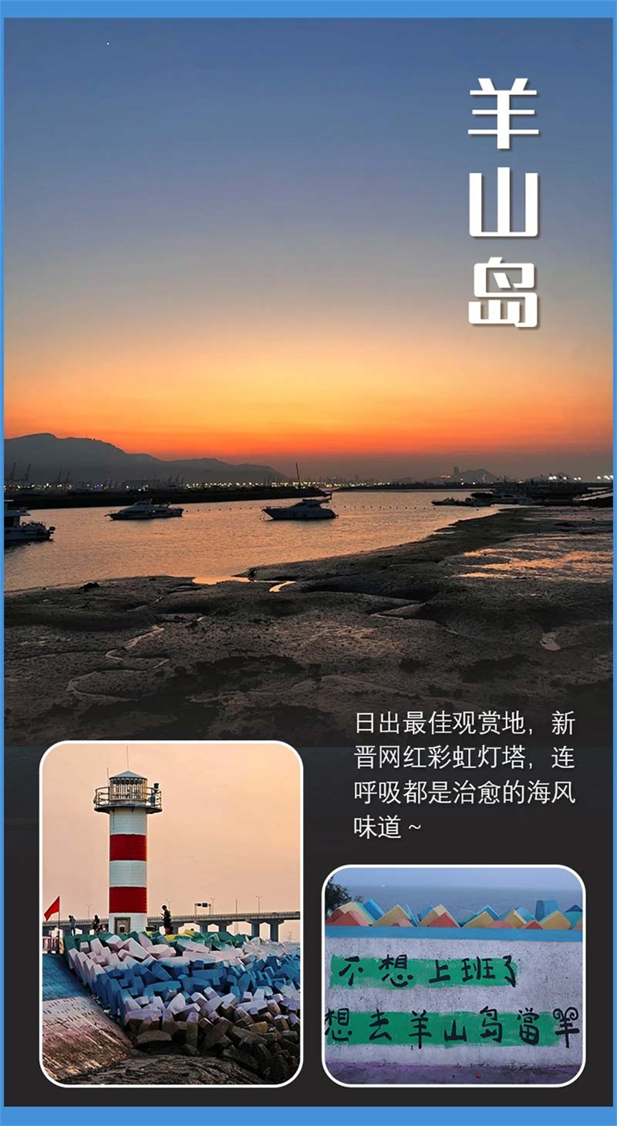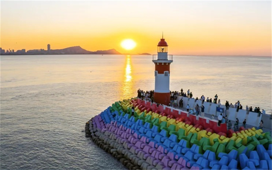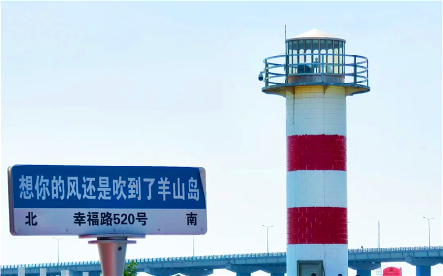 在这里可以参观羊山岛博物馆,展示了羊山岛地区的文化历史、风土人情、科普社教和产业资源,凸显羊山岛海洋地域特色。沿街拾阶而上,可以看到巨幅羲和浴日雕塑、羲和宫,霜降时节。顺着幽长的登山小径,漫步于松林之中,站在观桥台前抚栏凭眺,海天相间处一座大桥映入眼帘,宛如一条巨龙,卧波跨海,飞架南北。最后我们可以来到彩虹灯塔,在拦海大堤、护坡、栈道,绘制彩虹、沙滩、斑马线等元素丰富的文化墙,展示美丽海岛新形象。