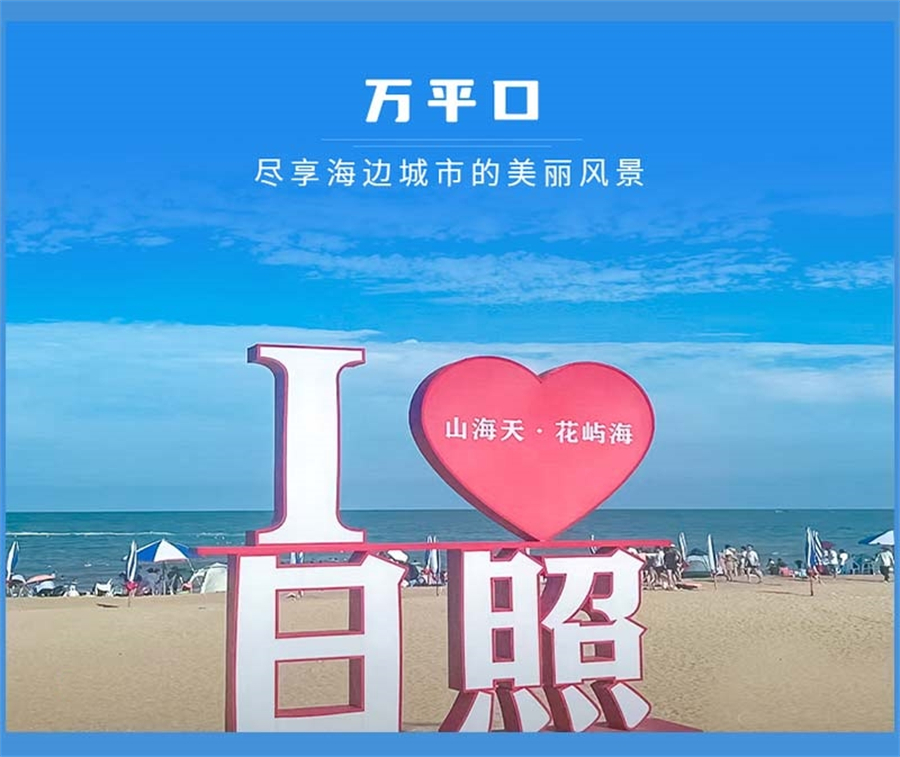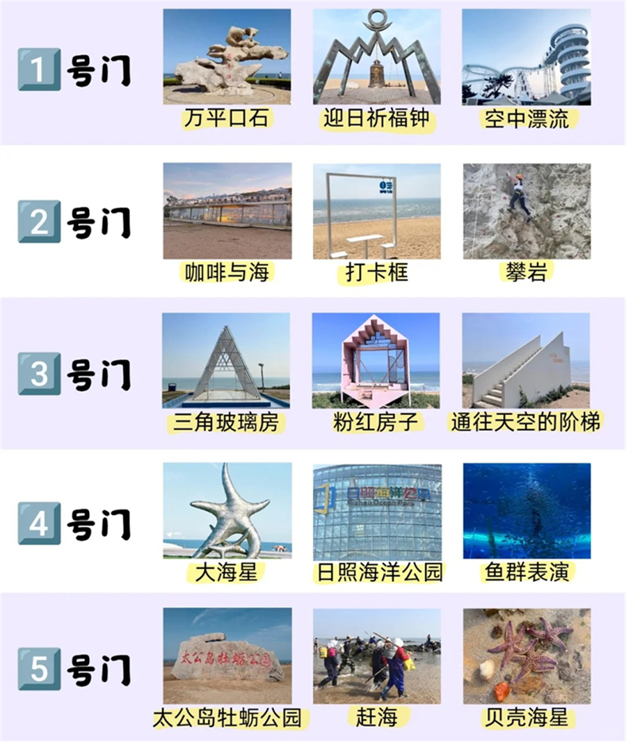 “旅游来日照,必到万平口”!万平口一号门是万平口景区的正大门,这里有很多地标性建筑。你可以在这里拍个旅游封面,绝对有面子;二号门进入的区域面积很大,适合不想走路的朋友,你可以花20块钱坐小火车,沿海岸线转一圈,轻松看海;三号门是网红打卡地,这里聚集了很多帅哥美女,来这里看看,饱饱眼福也是不错的选择,,拍照打卡绝对出片;四号门这边比较安静,人少景美,适合拍照,这里还是离东夷小镇最近的地方;五号门是太公岛广场,主要是万平口的出口。
