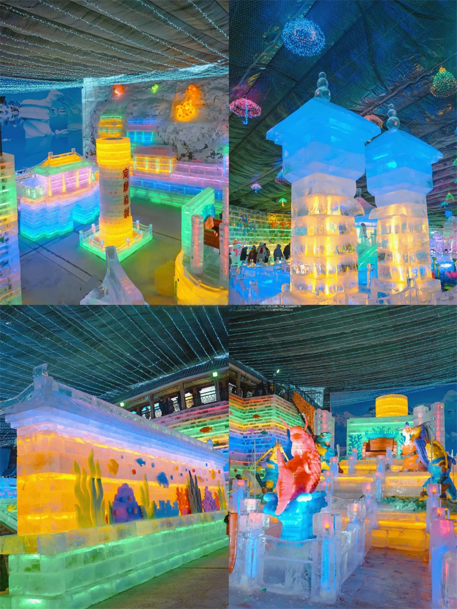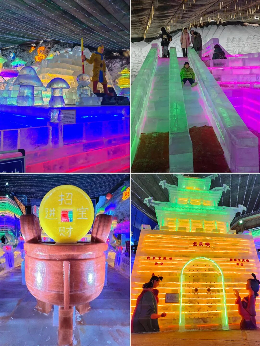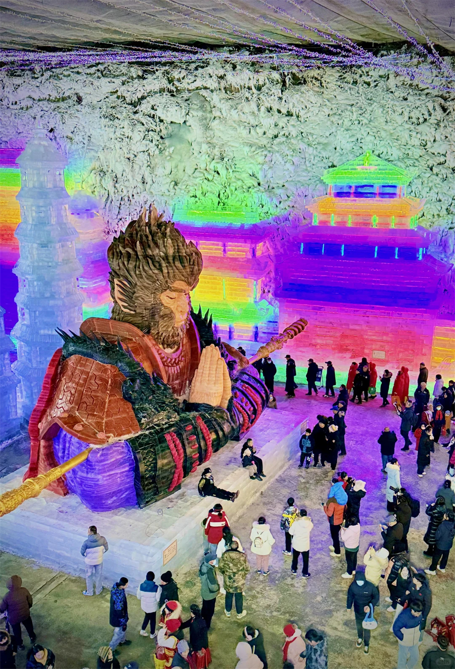2)前往 “龙庆传奇・灯映山河” 亮花灯观赏区,欣赏传统彩灯与现代光影科技交织的美景。接着前往 “致敬经典・传奇再现” 冰雕艺术区,感受 “大闹天宫” 主题冰雕的魅力。
