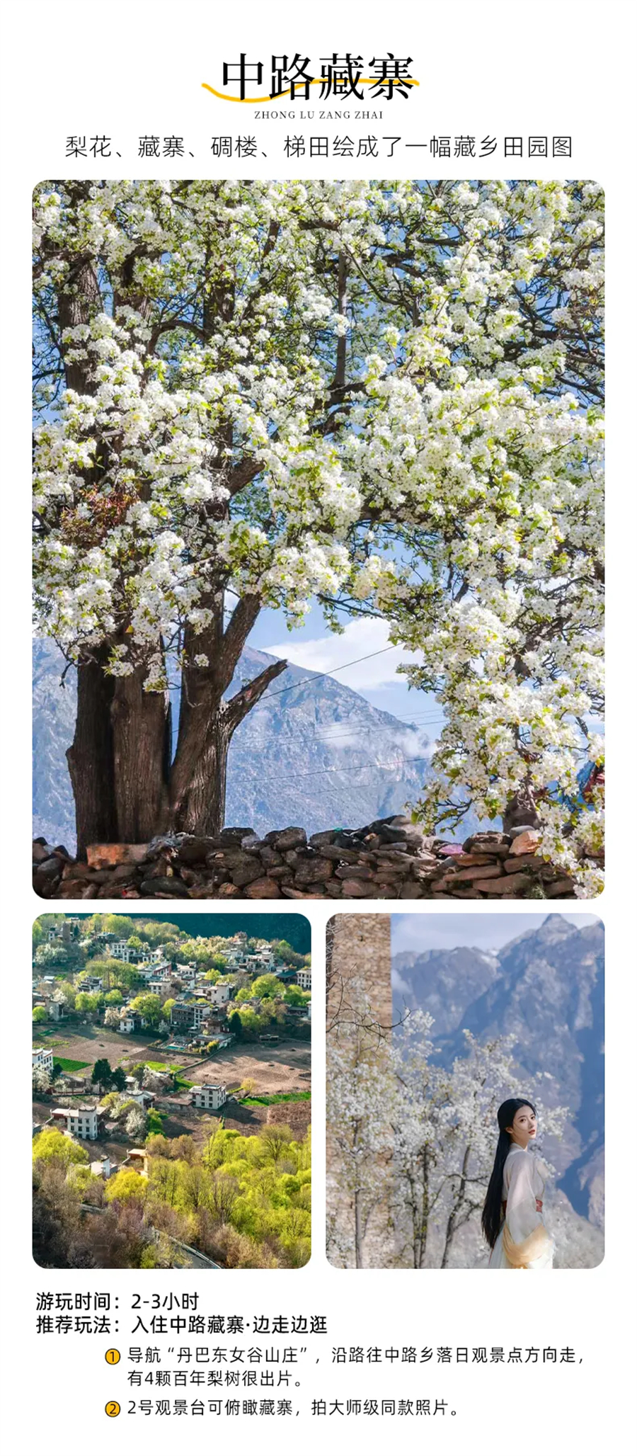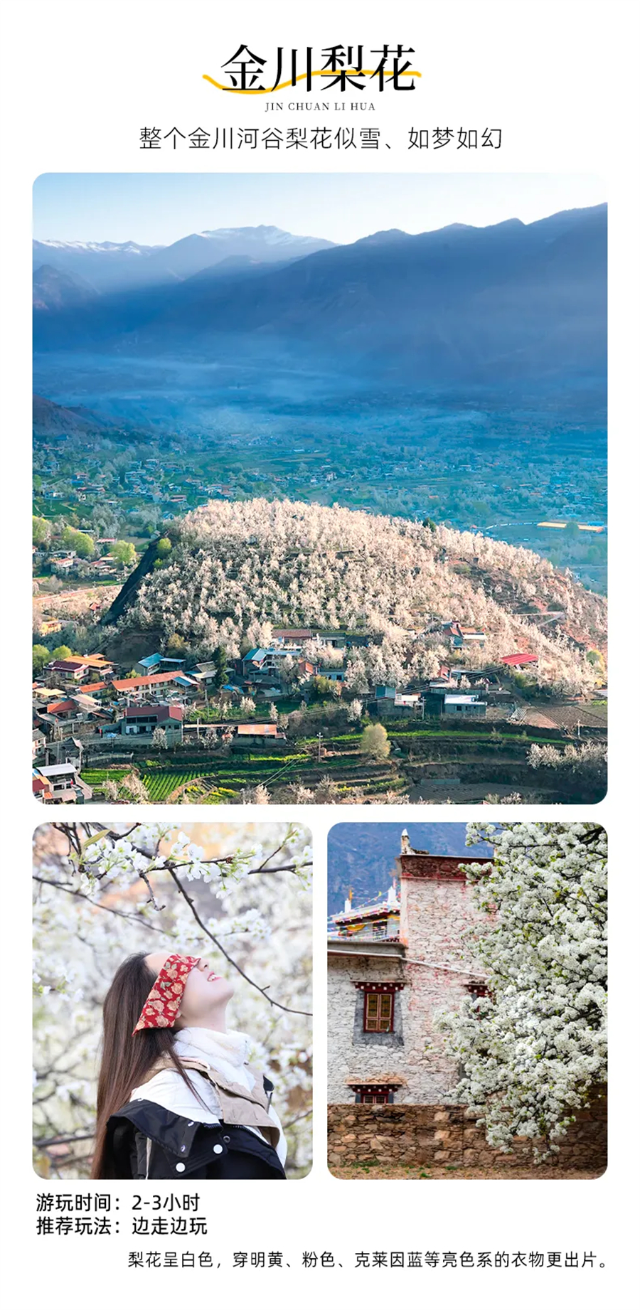 【行程概述】早餐后游玩【中路藏寨】,相比甲居藏寨的名声在外,中路更显宁静一些,春天梨花盛开,更是增添了一抹灵气,置身其中让人有漫步世外梨源的感觉,遥望远处,可以看到嘉绒藏族人民心中的神山--【墨尔多神山】,拍下藏寨碉楼与墨尔多神山同框的画面。适时前往金川,沿途观赏大渡河谷两岸藏寨掩映在花海中的美景,这一带是丹巴嘉绒藏族文化的起源地之一,人文景观也颇多,可尽情游览拍摄。下午观赏和拍摄【金川河谷】百里梨花的壮观景象。金川素有“中国雪梨之乡”的美誉,无论河坝沃土还是半山坡地,漫山遍野都栽种梨树,每到仲春三月,万亩梨海,百里白蕊,整个金川河谷似茫茫雪海。晚上入住马尔康。