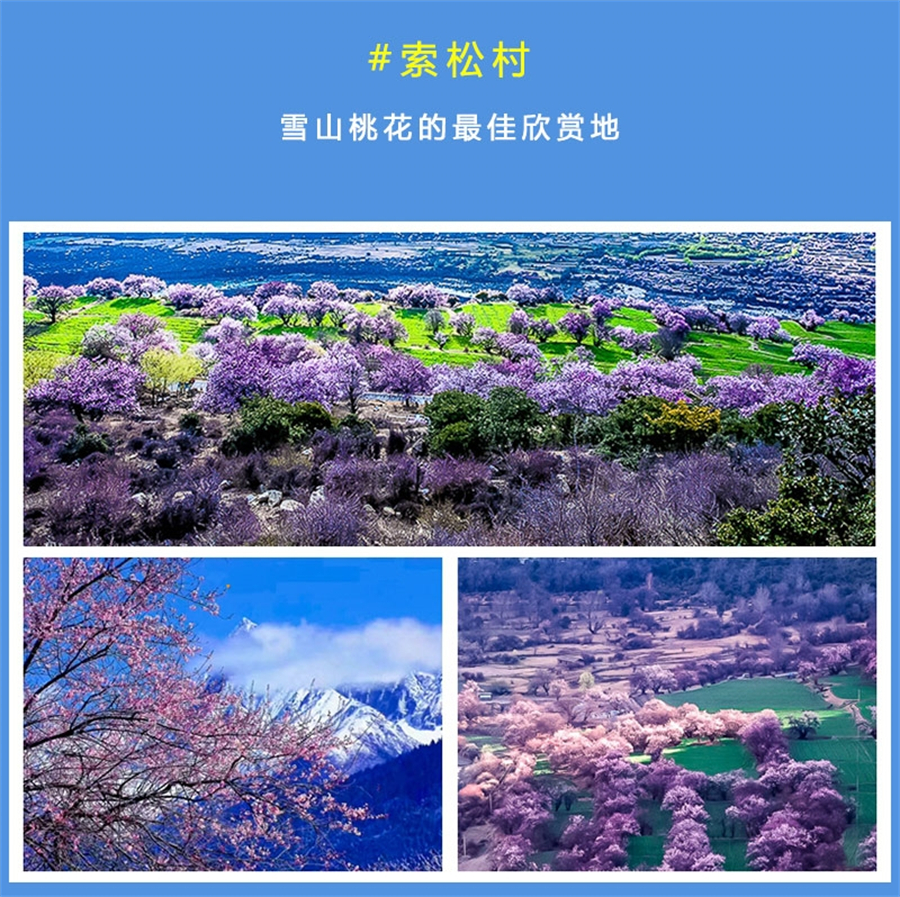 D8|林芝-雅鲁藏布江大峡谷-索松村桃花-索松村/林芝(全程100km)早餐后从林芝出发,换乘当地观光车进入【雅鲁藏布江大峡谷】,到达索松村,这里是拍摄南迦巴瓦及林芝桃花的好地方,索松村的桃花是遗世独立的,不沾烟火气,索松村的桃花树更像是野生的,这里一棵,那里一棵,没有规律可循。虽然这里也有不少慕名而来的游客,却不影响它的美感。你可以任意选一个地方,自己坐在一个角落里,静静地看桃花,看雪山。3月的林芝,寒意未尽,却已是花的海洋。远方雪峰皑皑白雪,桃花已如醉霞绯云般,粉嫩妖娆的桃花,映着蔚蓝云天,美不胜收。【沿途景点】:雅鲁藏布大峡谷、林芝桃花、索松桃花、尼洋河、南迦巴瓦峰
