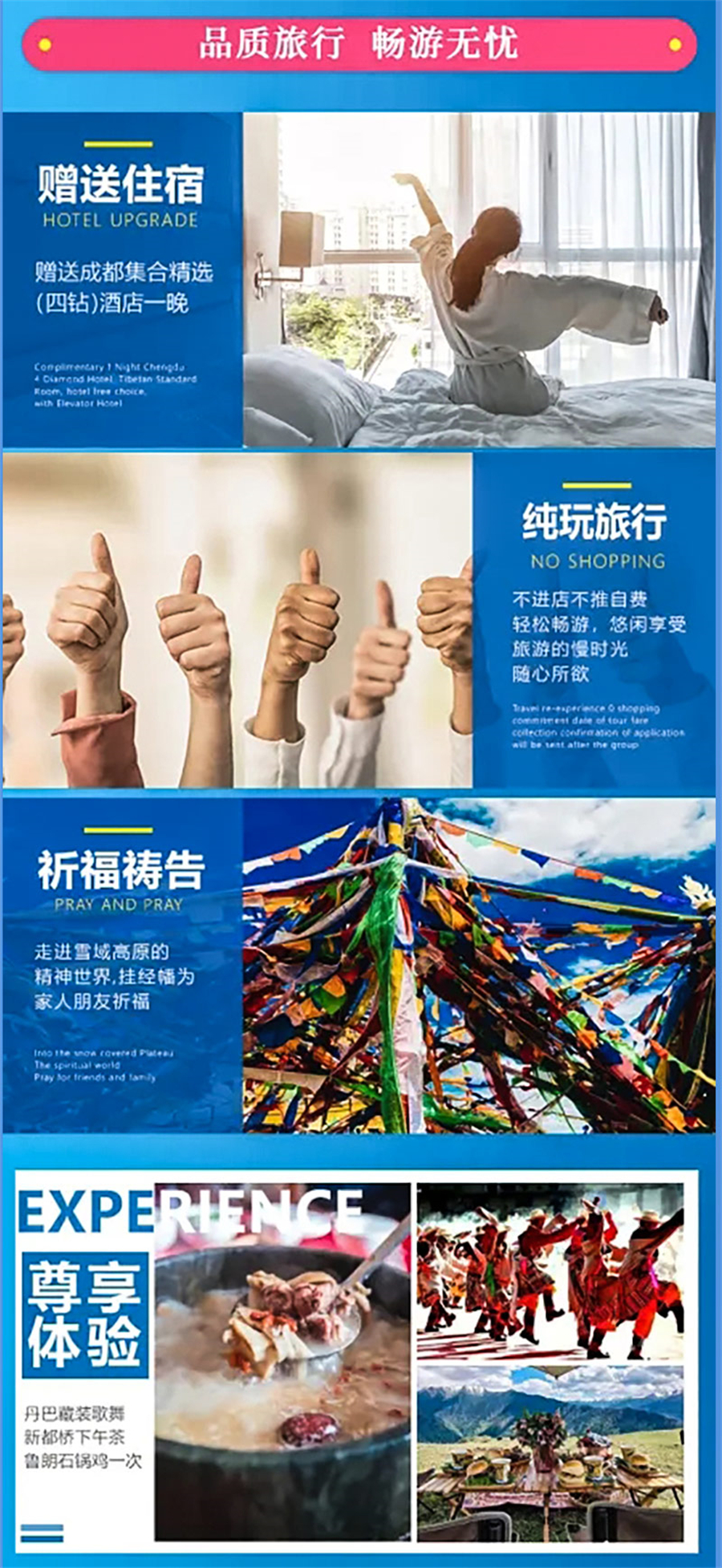 3)门票:甲居藏寨门票、米堆冰川门票、雅鲁藏布江大峡谷门票、巴松措门票;门票为景区首道大门门票,不含摆渡车等其它费用;
