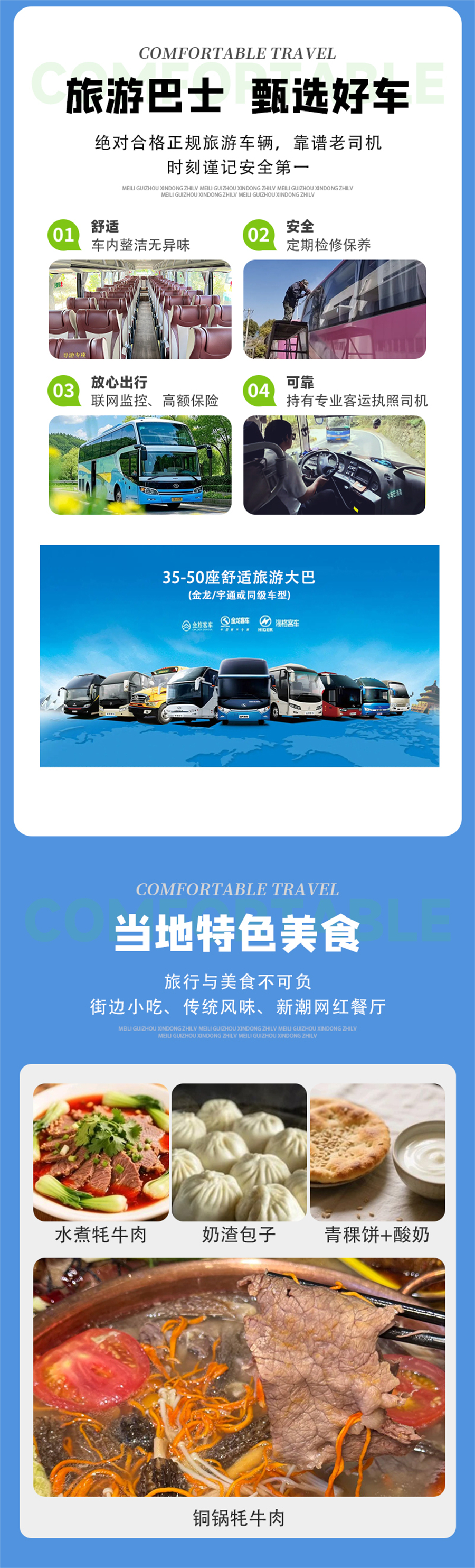 2、车上座位顺序为集合时先到的先坐,发车之后保持原车原座(有老年人、晕车等情况的领队将酌情调整);