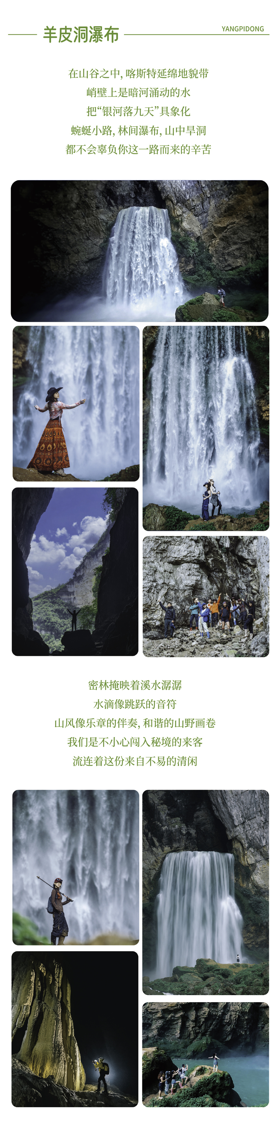 D2|贵阳 - 羊皮洞瀑布 - 黔西(宿)用餐:含早餐,中晚餐自理交通:上午80KM/1.5H、下午75KM/1.5H住宿:黔西县城早餐后乘车前往羊皮洞瀑布,从起点徒步约4公里到达峡谷底部瀑布奇观,凹造型拍美照,近距离感受磅礴的“天河坠地”景观。中午可以在瀑布附近的摊位简单解决午餐(或自带干粮)。午餐后前往瀑布旁边的洞穴探秘;适时回到起点,乘车前往黔西县城入住酒店,晚上自由活动。