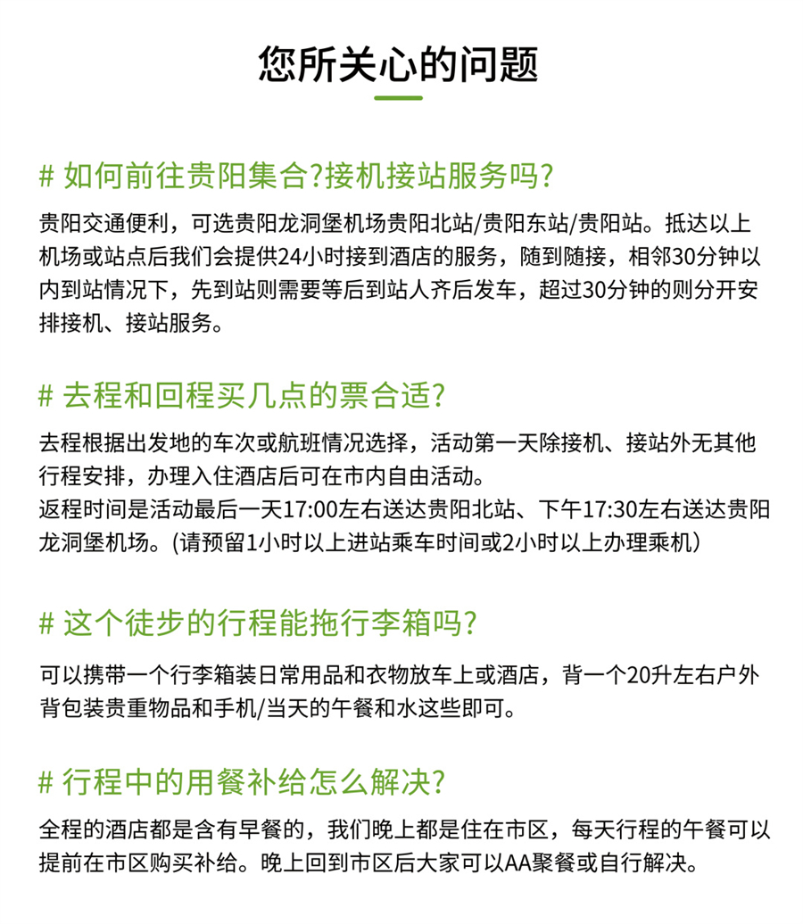 温馨提示:① 贵阳是西南交通枢纽中心,各地直达航班、高铁动车、火车交通便利,可根据个人需求结合出发地的车次、航班购买。② 酒店一般在14:00后方可办理入住,早到的小伙伴如未到酒店入住时间,可在酒店寄存行李自行游玩贵阳。领队会在集合当天下午在活动群内发布第二天行程需要准备的物品和注意事项及告知次日行程安排③ 接站司机会在出发前一天晚上21:00前短信通知您,如未收到短信请联系微信活动群内的行程管家即可,我们将会让司机再次联系您。
