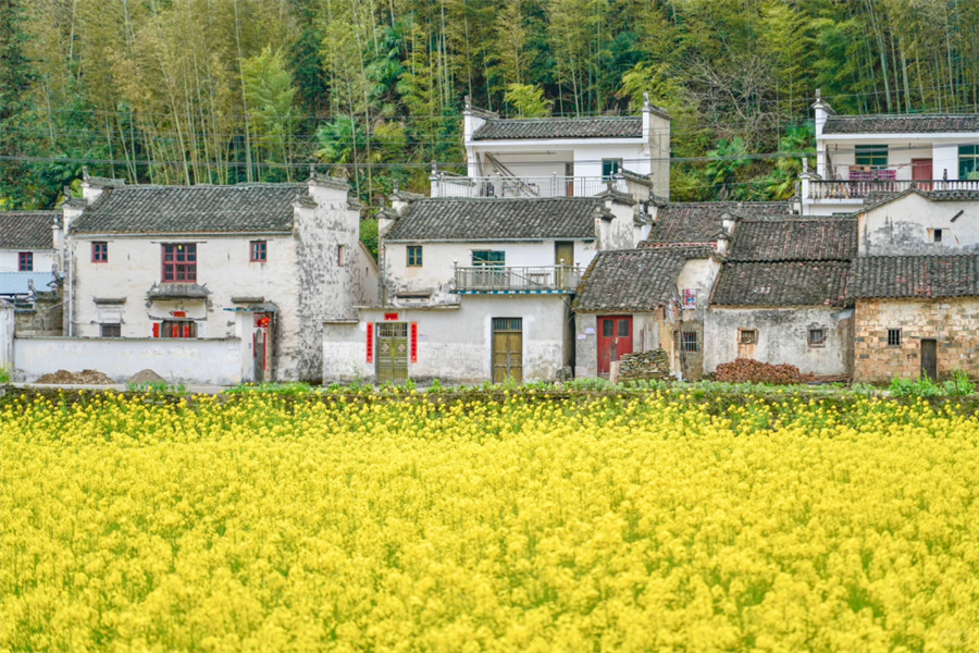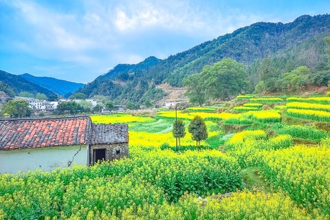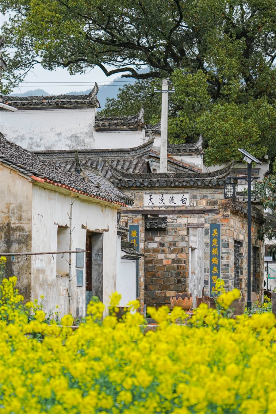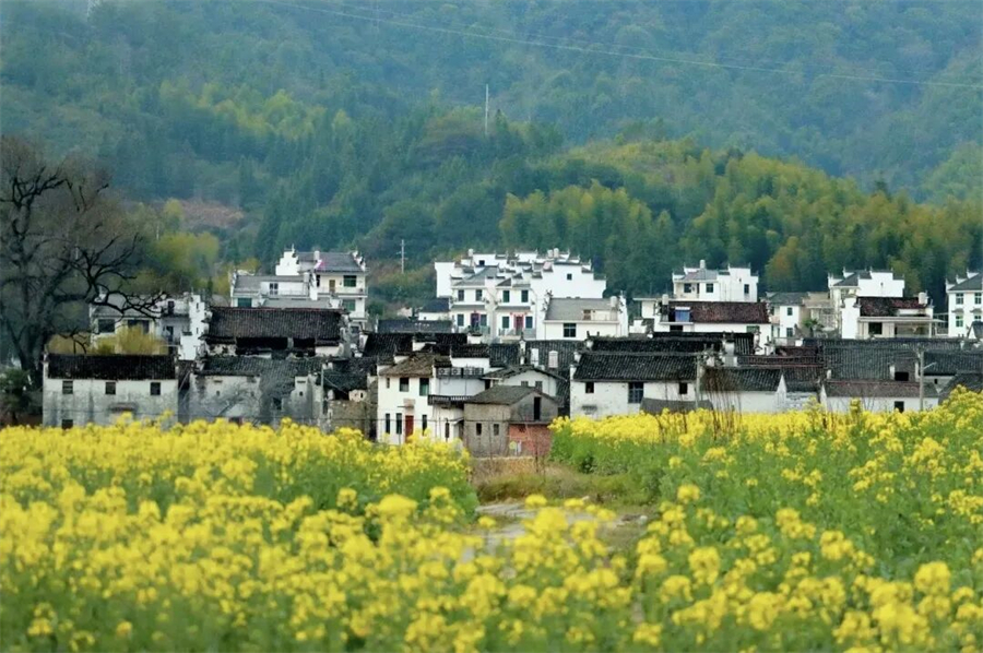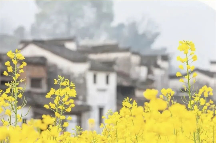黄灿灿的油菜花与远山、近水、粉墙、黛瓦相映成趣