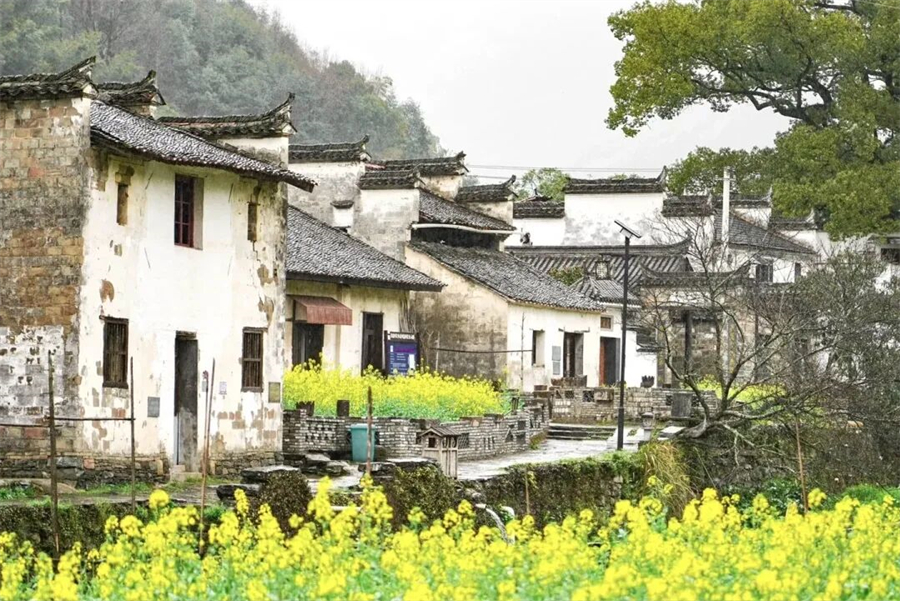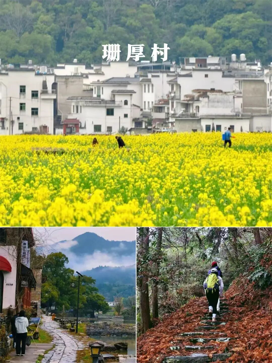 『井坞村』在地图上可能也找不到这个小村庄。只有几户人家,从古道里走出,豁然开朗,便见到了井坞,村庄周围种满了油菜花,与徽州古村落相得益彰,引人入胜。『珊厚村』坐落在山窝里,四面环山,没有公路,只有古驿道相通,北可以去庆源,南可以去下坦,古驿道沿着一条峡谷前行。一路上有瀑布、水潭,春天时,山花烂漫,村子里的房屋错落有致,房前屋后满是桃树、梨树,加上村口的油菜花,同时开放,遗失的古村落。