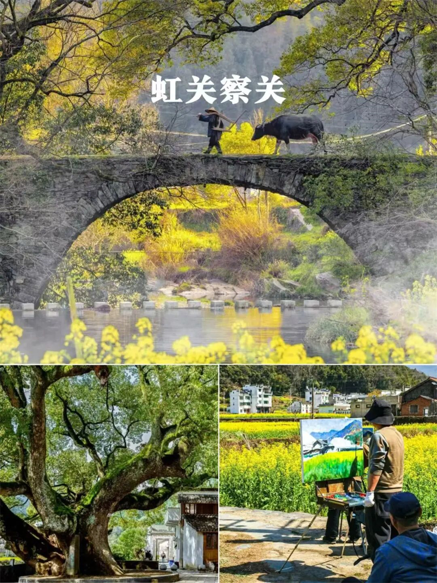 从婺源虹关古村沿着古桥边的油菜花小道,随意走走就去到了附近另一个静谧的小村庄:察关村,这里也有一座古桥,春天的河水清澈碧绿,几百年的老樟树开始萌发春天的绿意,在桥下拍照的时候还恰巧碰到了老人牵牛过桥。