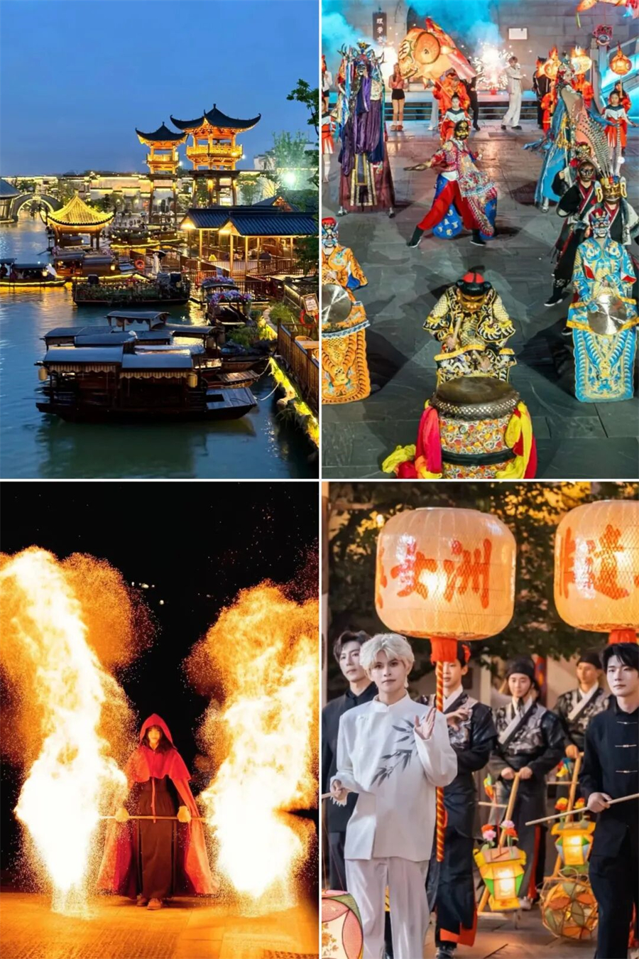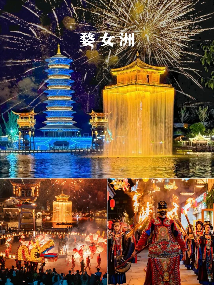 婺女洲婺女洲度假区以婺女飞天传说故事为核心,充分挖掘徽州文化的美学内涵,运用理学、徽商、非遗等多元文化致力于构建中国新式徽艺度假生活。现实版“盛世徽州夜”总要去一次婺女洲吧!!去感受一次“东风夜放花千树,更吹落,星如雨”的热闹过年氛围,踏入景区大门,映入眼帘的便是繁华的灯会和古街,各式各样造型的灯笼令人目不暇接…….原来古诗词里描述的场景真实存在,夜晚小镇被灯光点亮,湖中金阁仿佛天上宫阙。