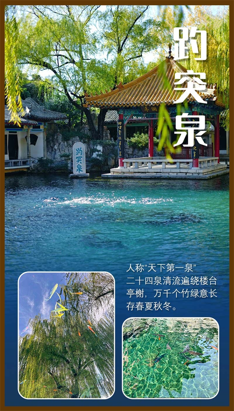 趵突泉,三窟并发,声如隐雷,是济南七十二名泉之冠。趵突泉、金线泉、漱玉泉…水跳跃在时间的弦上,奏出灵动的音符,遇城则鸣。趵突泉公园是一座融合了江南园林特色的自然山水公园。