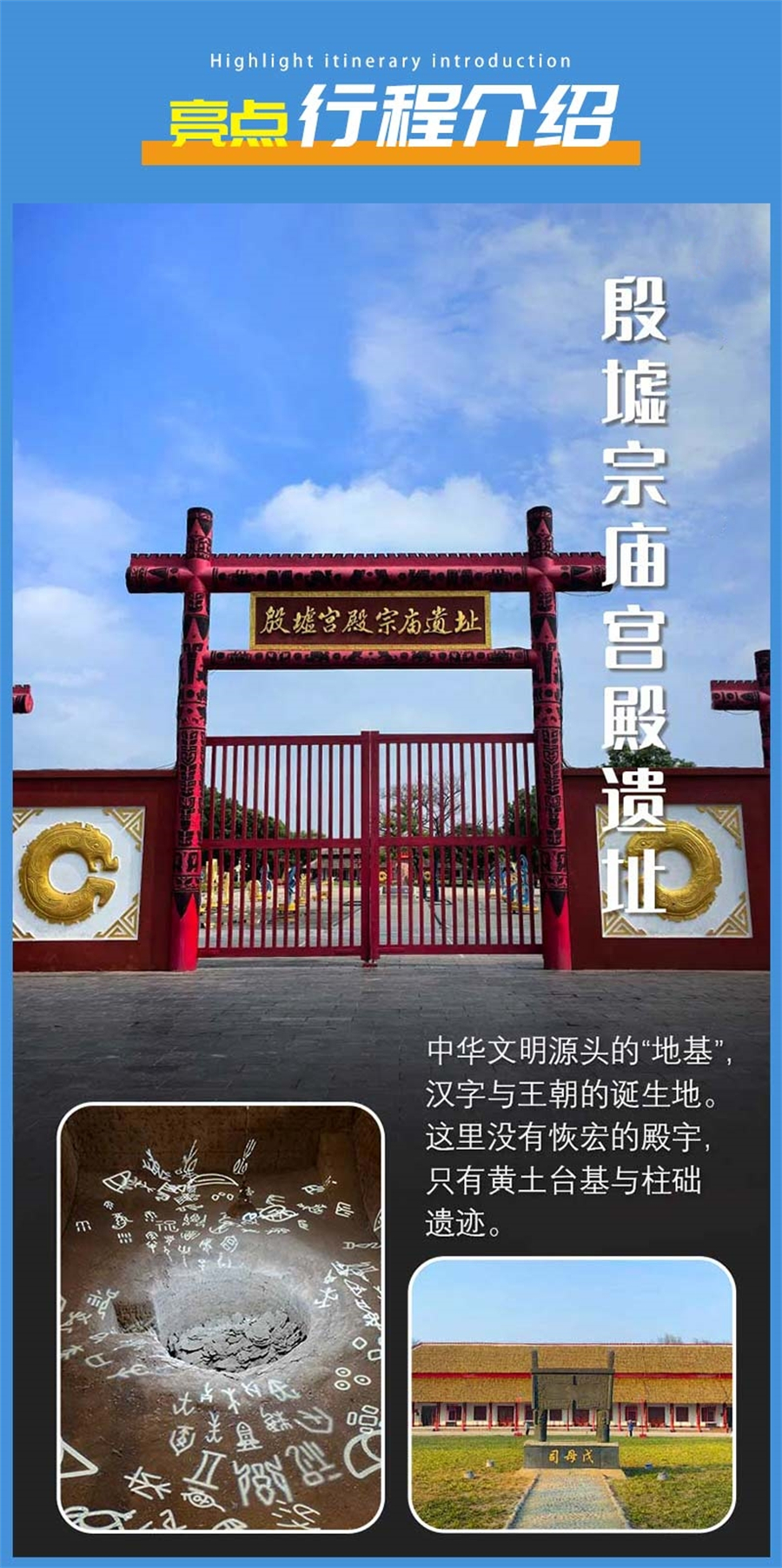 D1|北京-殷墟宗庙宫殿遗址/王陵遗址-殷墟博物馆-鹤壁夜景-鹤壁(宿)请按集合信息通知准时集合出发,一路欢歌笑语开始旅程。下午到达中华文明起源地,一个被列入有生之年必去清单的宝藏地安阳殷墟,感受古都千年之前的盛世繁华!首先我们游览【殷墟宗庙宫殿遗址】。殷墟宫殿宗庙遗址是中国首个文献记载并经甲骨文与考古证实的商代晚期都城遗址,距今约3300年历史,为甲骨文发祥地和中国考古学诞生地。殷墟宫殿区驰名中外,为世界文明古国中最著名的“古典城邦”之一。50余座建筑遗址分“宫殿、宗庙、祭坛(甲、乙、丙)”三组,宏伟壮观。另外还发现铸铜遗址等。宫殿区出土大量的甲骨文、青铜器、玉器、宝石器等珍贵文物。殷墟文物有的是华夏之最,有的是世界之冠,蕴藏着殷代先民们的创造、智慧和技能。考古专家评价,殷墟“发掘着一个典型的 ”。具有“都市、文字和青铜器三个要素”。“是一个灿烂的中国文明”。如果时间富裕还可以参观【殷墟王陵遗址】,如时间不够则取消改景点。殷墟王陵遗址是世界文化遗产殷墟的重要组成部分,与殷墟宫殿宗庙遗址、洹北商城遗址等共同组成了殷墟遗址。建有M260大墓揭示展示和保护房工程、12座王陵大墓的植被标示以及480余座祭祀坑、兽祭坑展示工程等。殷墟王陵遗址已成为一座初具规模的集文物保护、科学研究、宣传教育和旅游休闲为一体的大型遗址公园。最后我们前往【殷墟博物馆(新馆)】参观,一起见证世界的商文明。殷墟博物馆,是首个全景式展现商文明的国家重大考古专题博物馆。设8个展厅,地上共三层,是首个全景式展现商文明的国家重大专题博物馆,是黄河国家文化公园重点项目之一。 在展览布局方面,聚焦“伟大的商文明”这一主题,设有3个基本陈列、4个专题展览和1个特色沉浸式数字展,展出青铜器、陶器、玉器、甲骨等文物近 4000 件(套),展陈文物数量庞大、类型多样,其中四分之三以上的珍贵文物属于首次亮相,从商代史、甲骨学、考古史、商文明的世界传播等多个角度,全方位阐释商代繁盛的城市文明、完善的礼乐文明、发达的青铜文明、灿烂的文字文明以及高超的手工业技术等,生动呈现商文明对于中华文明乃至人类文明发展史上的重要地位和作用。在形式设计方面,以庄重、大气为基本遵循,广泛运用人工智能、多媒体等数字技术、裸眼3D技术,赋予文物、文献、甲骨记载等新的时代表达方式,提升全景式展现商文明的广度、深度、精度,构建文物、历史与数字虚拟空间交互场所。让人们多维度、立体化、沉浸式感受商文明传承和甲骨文魅力。适时自行返回酒店休息。之后大家可以自由结伴欣赏夜景,品尝美食。推荐地:中凯小吃街、朝歌里、鹿台阁等……