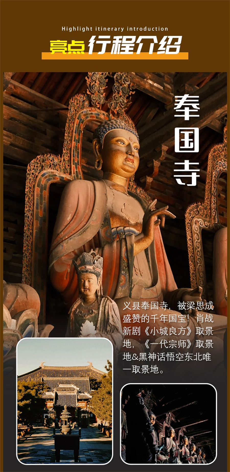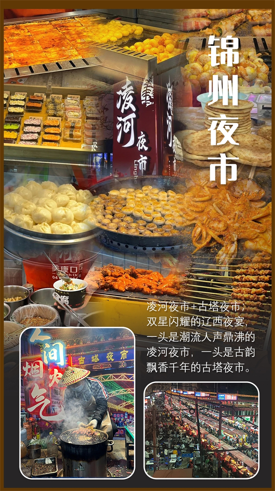奉国寺,俗称大佛寺,是中国国内现存辽代三大寺院之一。奉国寺坐北朝南,占地面积约6万平方米,现存有重建的外山门、清朝时期重建的内山门、牌楼、钟亭、碑亭、天王殿以及辽代时期保存至今的大雄殿等建筑 。奉国寺的大雄殿、七佛塑像和建筑彩画三者并称“奉国寺三绝”,是集考古、绘画、雕塑等文化价值于一体的皇家寺院,建筑方法代表了11世纪中国建筑的最高水平,并为日后北京故宫的修造提供了成熟的建构方法。奉国寺是国务院 1961 年公布的全国第一批重点文物保护单位,2008年晋升为国家4A 级旅游风景区,2012 年进入中国世界文化遗产预备名录,2022 年入选中国建筑学会 “2021-2025 年中国建筑学会科普教育基地” 依托单位,被中外游客美誉为 “天下第一宝殿・世间佛祖道场”。晚上|抵达锦州安排住宿。之后可自由结伴前往锦州特色夜市(凌河夜市/古塔夜市)品尝美食,欣赏夜景……