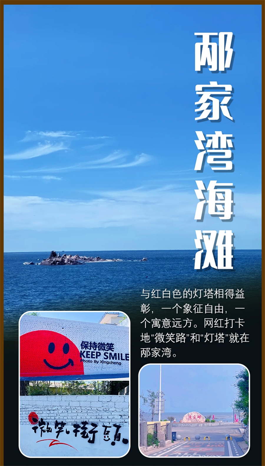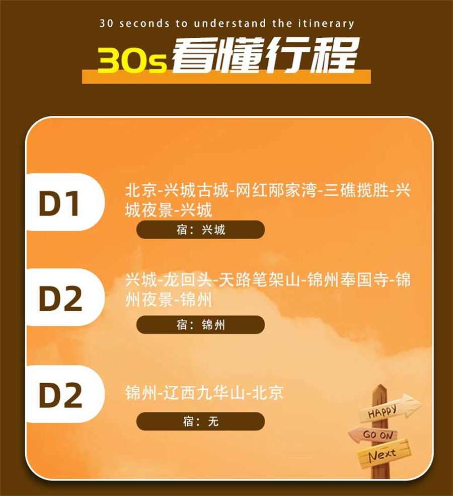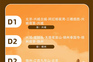 D1|北京-兴城古城-网红邴家湾-三礁揽胜-兴城夜景-兴城(宿)07:30|请按集合信息通知准时集合出发,一路欢歌笑语开程旅程。下午|到达兴城,我们首先前往『兴城古城』游览打卡。它是一座明代卫城,中国保存最完整的四座明代古城之一。古城大致呈正方形,四面正中均设有城门,门外有半圆形瓮城。城墙四角高高筑起炮台,用于架设红夷大炮。古城内正中央有一座钟鼓楼,东南角建有魁星楼,蓟辽都师府位于古城西门内。兴城古城原分内城和外城,历经近600年风雨侵蚀,外城已不复存在,内城经历代维修基本保持原貌。适时集合我们前往网红海滩『邴家湾海滩』。“向海风许愿,在山海相见”“风吹又日晒,自由又自在”……微笑路上的一道道橙白相间的标语,是看在眼里的诗意,是踩在脚下洒脱。与红白色的灯塔相得益彰,一个象征自由,一个寓意远方。网红打卡地“微笑路”和“灯塔”就在邴家湾。适时集合,前往酒店住宿。之后可自由结伴继续前往兴城古城欣赏醉美夜景,寻觅美食……