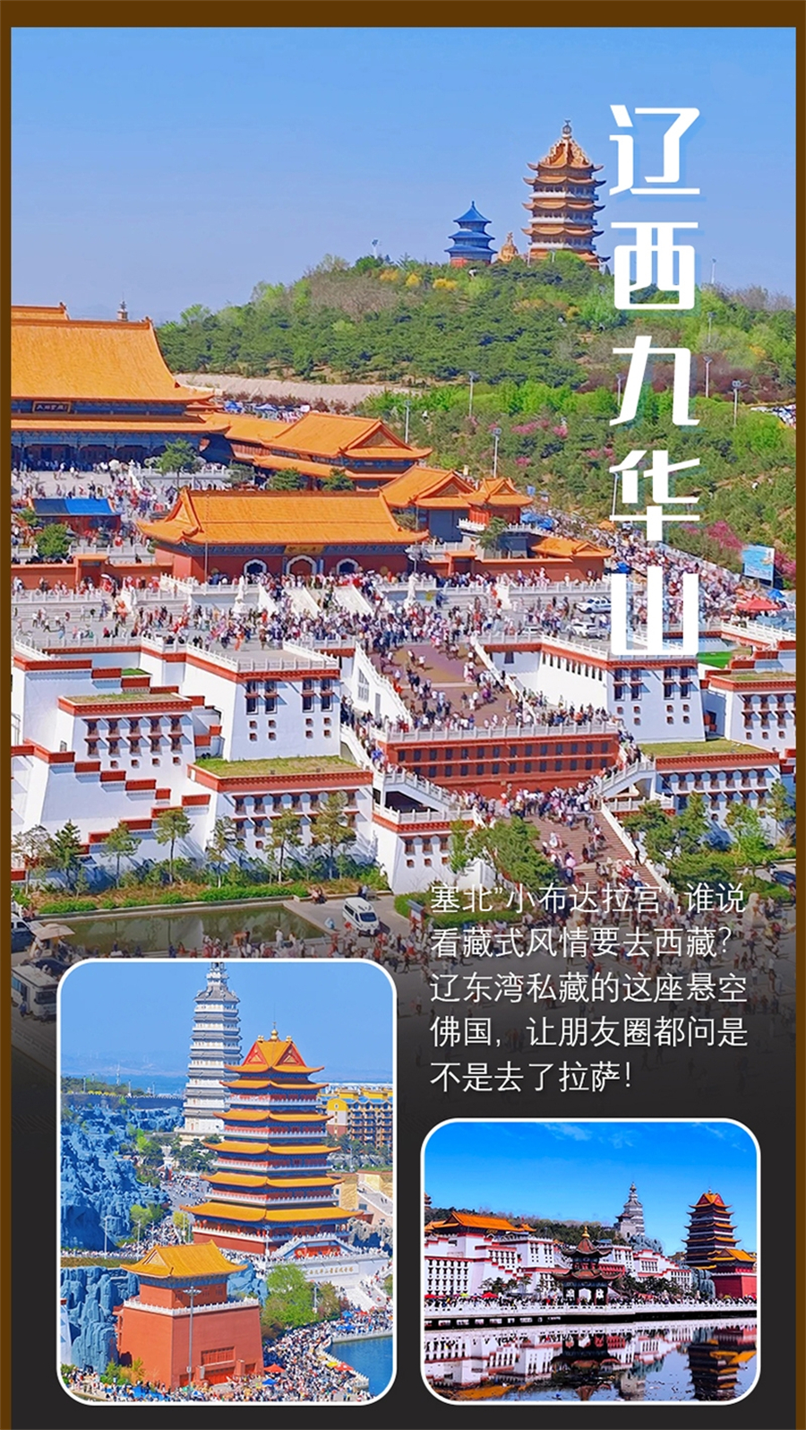 D3|锦州-辽西九华山-北京上午|我们前往『辽西九华山(小布达拉)』游览。辽西九华山位于辽宁省锦州市凌海市城区西南部,属国家4A级旅游景区,规划面积2200亩。景区因明金战争时期大凌河城之战得名,后金皇太极曾在此设立指挥所并命名。核心景观包含仿建的小布达拉宫慈海寺、天坛祈年殿等人文建筑。进入景区,这座精致的“小布达拉宫”映入眼帘,其背后则是雄伟的辽西九华山。游览之余,不妨租借一套藏族民族服装,以“小布达拉宫”为绝美背景,捕捉精彩瞬间,定能拍出令人惊艳的照片。上午适时集合返回,晚上到达出发地后解散,结束愉快三日之旅!*以上行程时间仅供参考,受天气、交通、客流、景区调控及队员体能等不同影响有可能会调整,以领队实际安排为准。