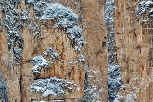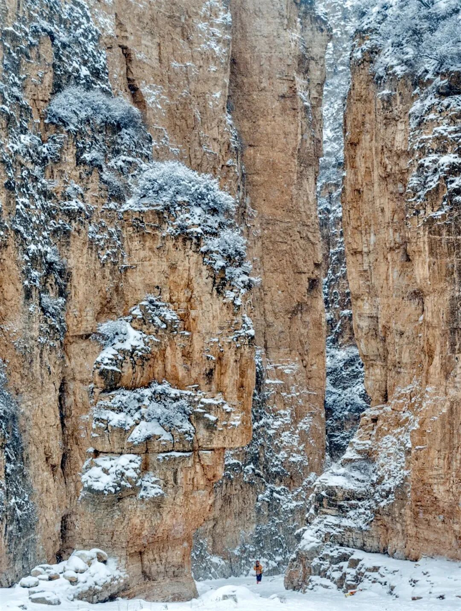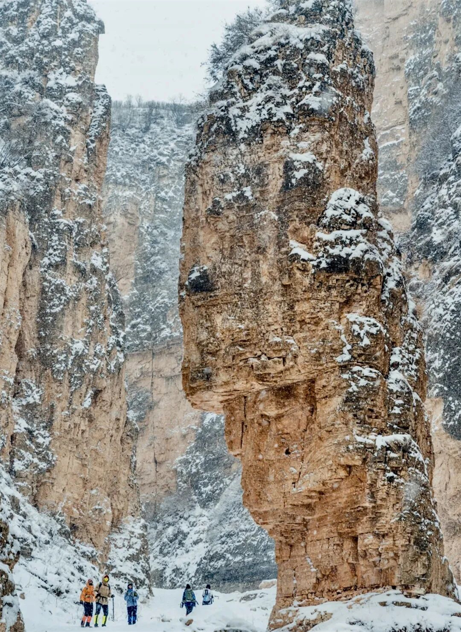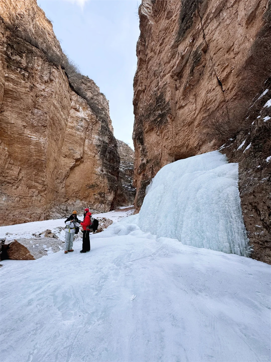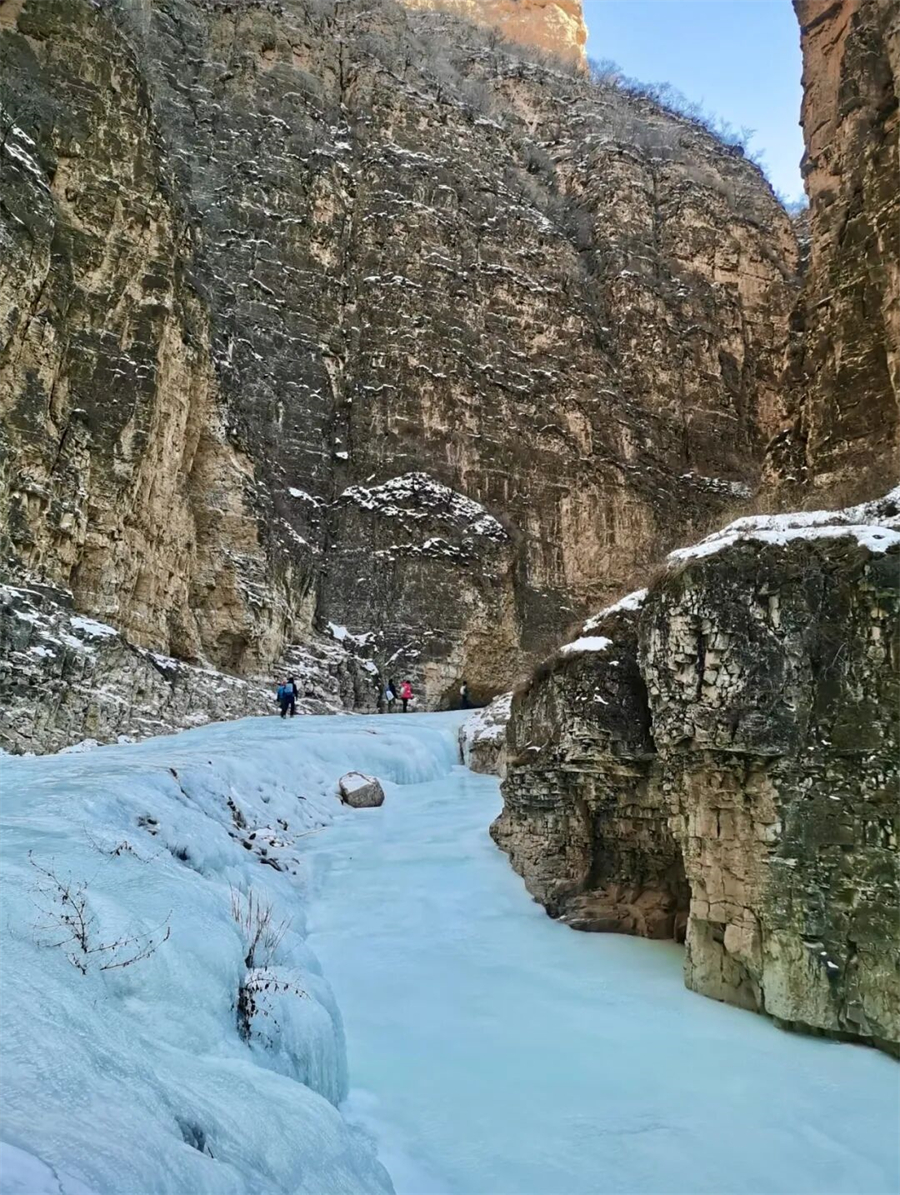 水峪里大峡谷全长7公里,九曲十八弯的格局分布着多级连瀑,两侧山体隽秀,景色优美、冰净雪白,怪石林立,呈现原始景观状态。不难想象,如果是在夏季,这里显然是一处清丽婉约的世外桃源。