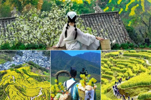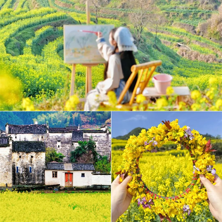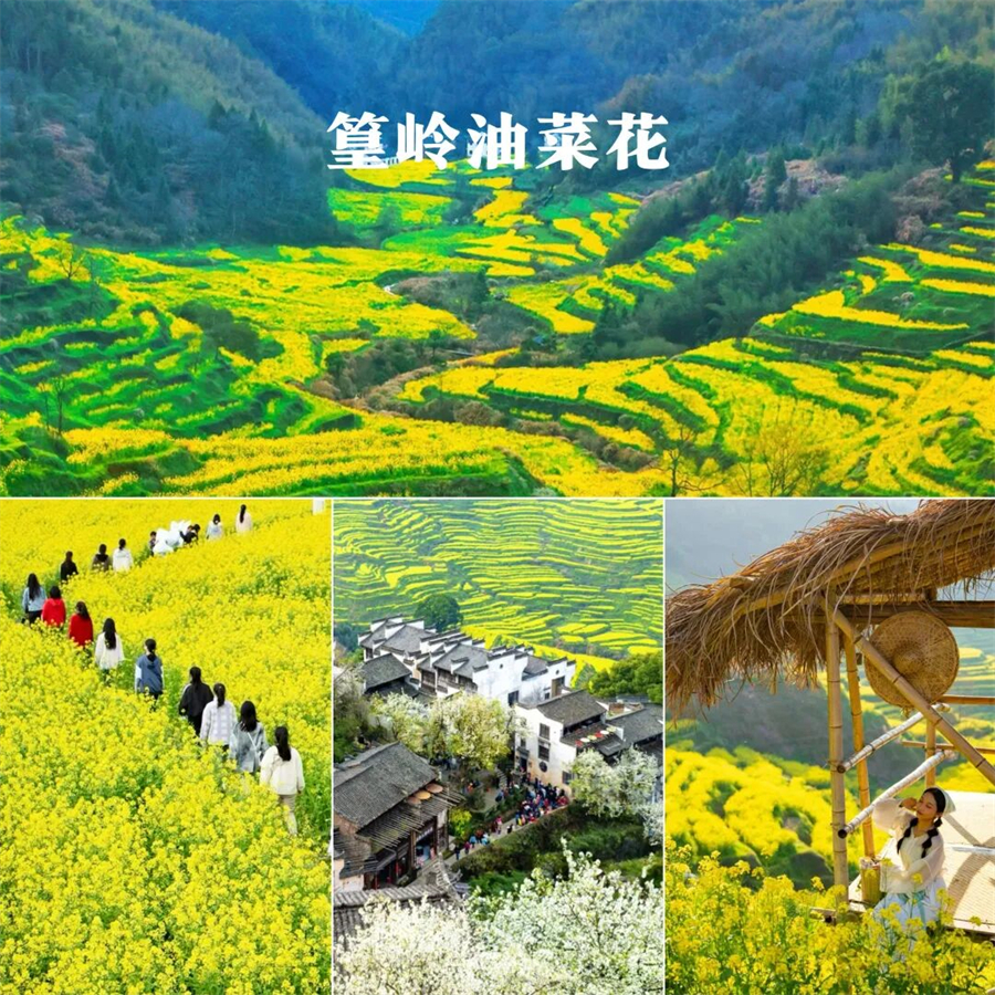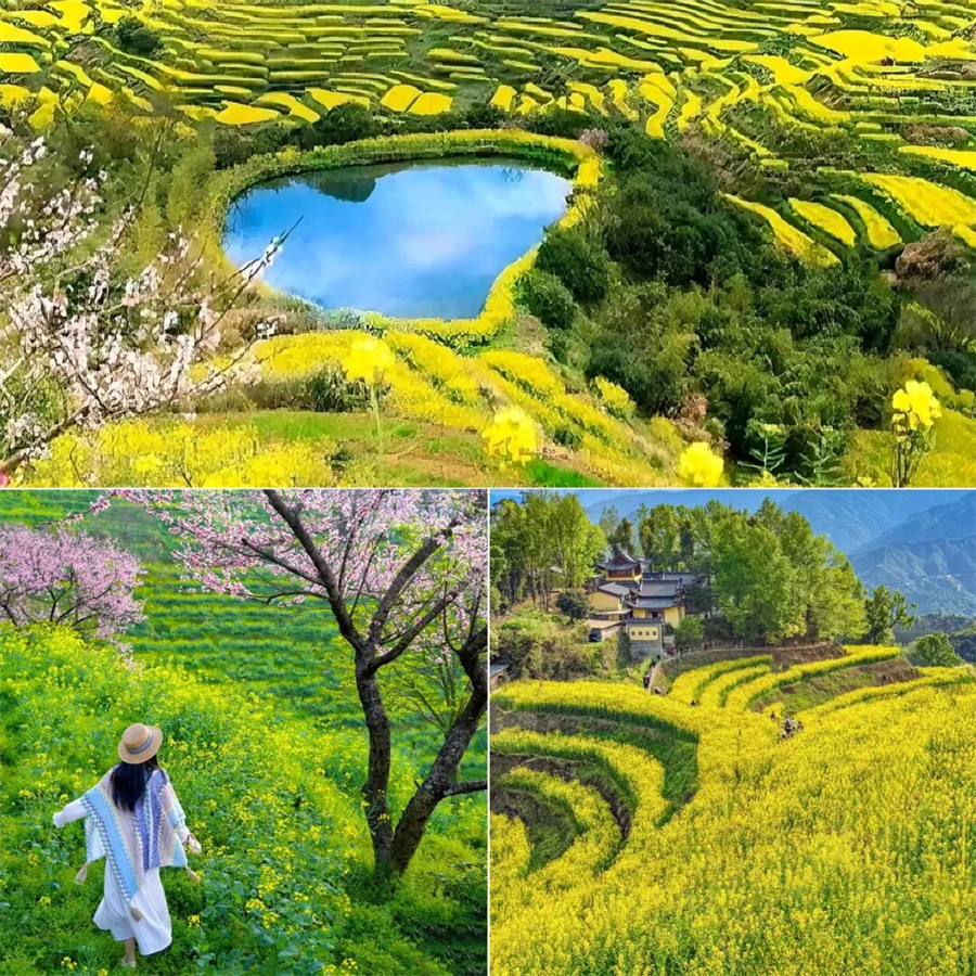 层层叠叠的高岭梯田上,金黄的油菜花竞相绽放,与白墙黛瓦的徽派古民居相映成趣,构成一幅生动的春日画卷。游客可乘坐索道直达山顶,沿途既能欣赏到古村梯田的秀美,又能领略高岭梯田的壮阔。在海拔500余米的高岭梯田,3公里"S型健身游步道"蜿蜒穿行于金色花海,为游客提供沉浸式赏花体验,摄影爱好者也可在此捕捉"大地指纹"般的梯田纹理。